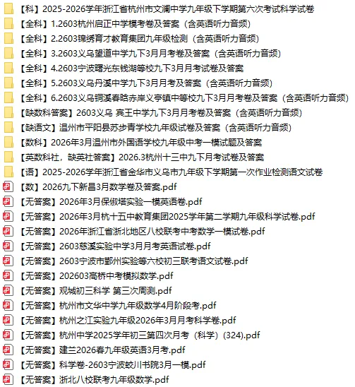 2025年一模卷: 0.2025.3浙江省中考模拟潮汐组合潮卷-全科试卷及答案 1.2025年3月浙派联盟九下各科试卷+答案(含英语听力音频) 2.2025年浙江省初中学校“TZ-8”共同体九年级一模试卷+答案 3.2025年3月初中名校发展共同体试卷+答案(含英语听力音频) 4.【金华市一模】2025年4月中考一模各科试卷及答案(含英语听力音频) 5.【温州市一模】2025年4月中考一模各科试卷及答案(含英语听力音频) 6.【湖州市一模】2025年4月中考一模各科试卷及答案(含英语听力音频) 7.【浙江J12共同体联盟】2025年4月中考一模各科试卷及答案(含英语听力音频) 8.【杭州富阳区一模】2025年4月中考一模各科试卷及答案(含英语听力音频) 9.【舟山市一模】2025年4月中考一模各科试卷及答案 10.【台州市一模】2025年4月中考一模各科试卷及答案(含英语听力音频) 11.【杭州市余杭、临平区一模】2025年4月中考一模各科试卷及答案(含英语听力音频) 12.【绍兴市一模】2025年4月中考一模各科试卷及答案(含英语听力音频) 13.【衢州柯城·江山·龙游一模】2025年初中毕业生学业水平调研测试各科试卷(含答案·听力原文无音频) 14.【嘉兴市一模】2025年4月中考一模各科试卷及答案(含英语听力音频) 15.【宁波市一模】2025年4月中考一模各科试卷及答案(含英语听力音频) 16.【丽水市庆元、龙泉一模】2025年4月中考一模各科试卷及答案(含英语听力音频) 17.【衢州市一模】2025年4月中考一模各科试卷及答案 18.【杭州市西湖区一模】2025年4月中考一模各科试卷及答案(含英语听力音频) 19.【杭州市拱墅区一模】2025年4月中考一模各科试卷及答案 20.【杭州市钱塘区一模】2025年4月中考一模各科试卷及答案 21.【杭州市滨江区一模】2025年4月中考一模各科试卷及答案 22.【杭州市上城区一模】2025年4月中考一模各科试卷及答案(含英语听力音频) 23.【杭州市萧山区一模】2025年5月中考一模各科试卷及答案(含英语听力音频) 24.【杭州市萧山高桥联盟】萧山高桥联盟一模全科试卷及答案(含英语听力音频) 25.【杭州市临安】临安一模全科试卷及答案(含英语听力音频) 26.【城东一模】全科试卷及答案 以下一模截图: