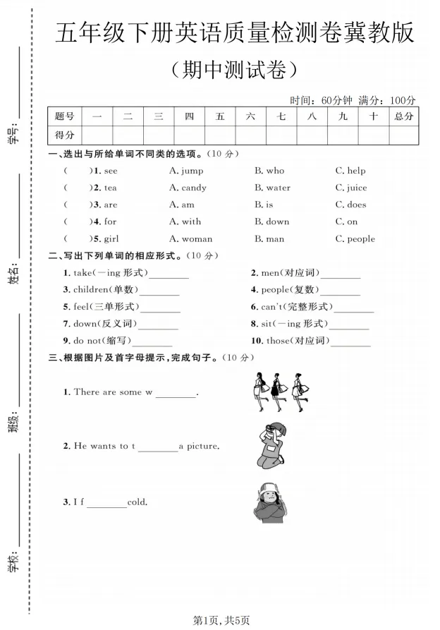 3-5年级(下)英语26春- 期中试卷《冀教版》|电子版可打印