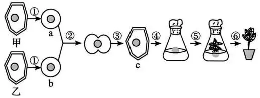 甲植物细胞核基因具有耐盐碱效应,乙植物细胞质基因具有高产效应。某研究小组用甲、乙两种植物细胞进行体细胞杂交相关研究,基本过程如图所示,最终获得高产耐盐碱再生植株。