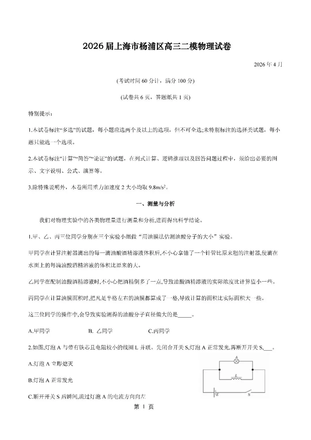 2026届上海市杨浦区高三二模物理试卷(含答案)