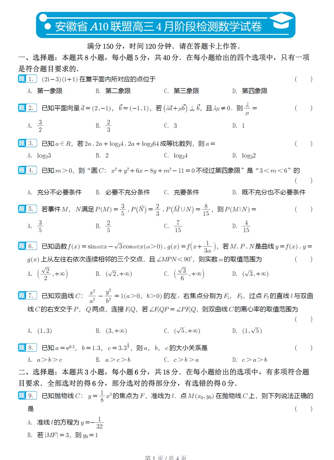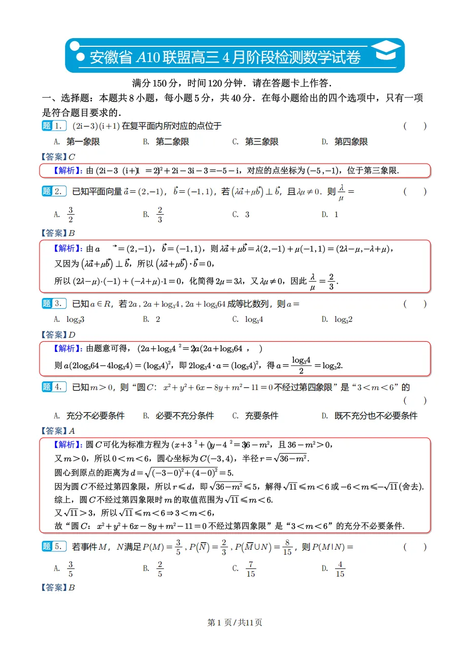 >必刷好卷→安徽省A10联盟高三联考数学试卷及逐题解析