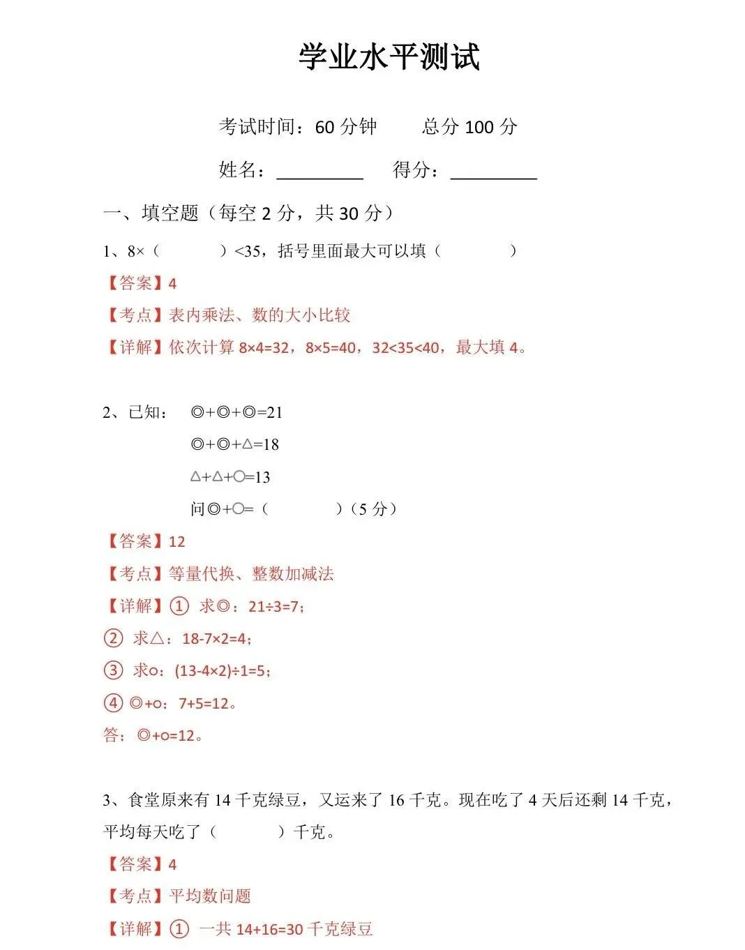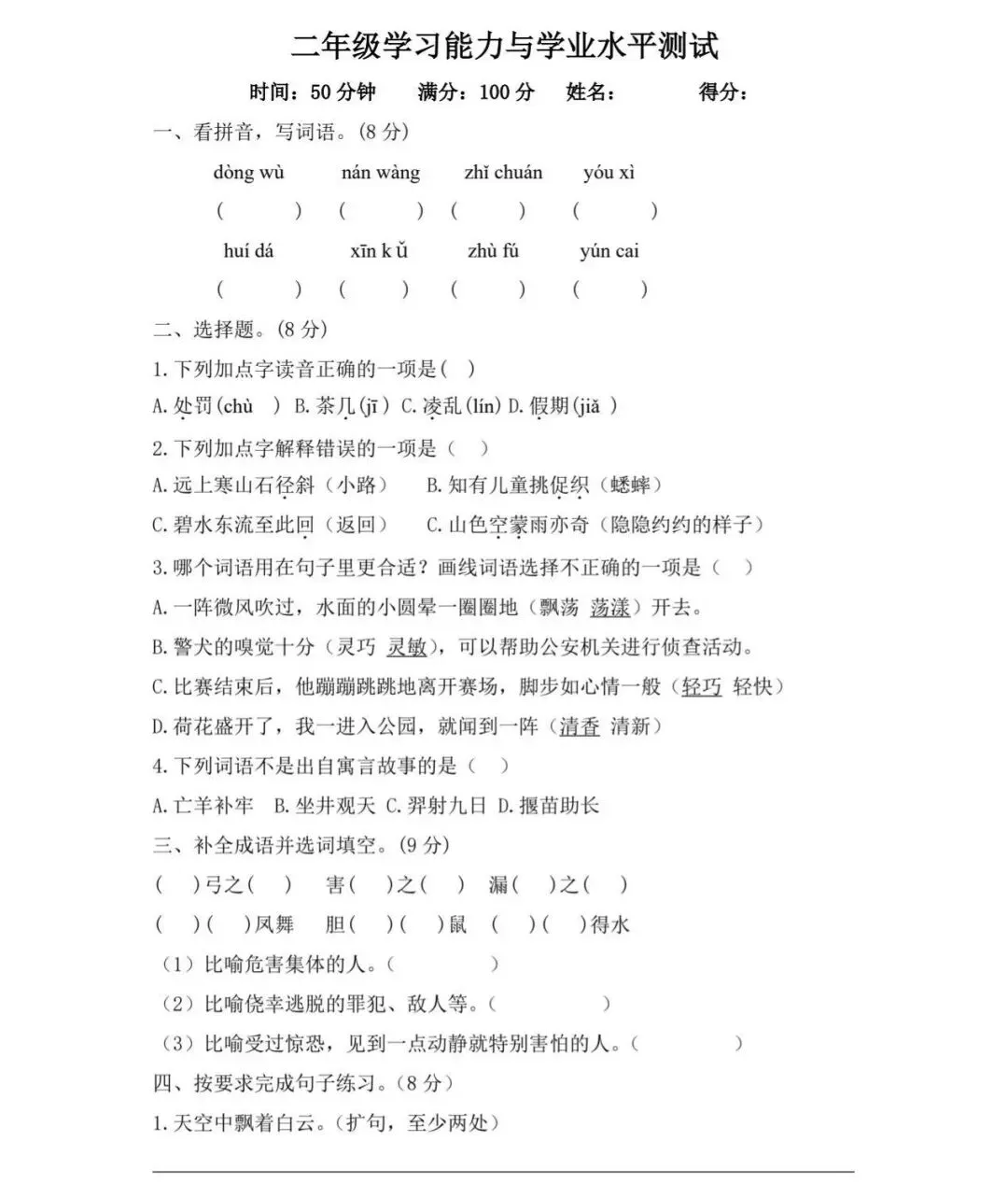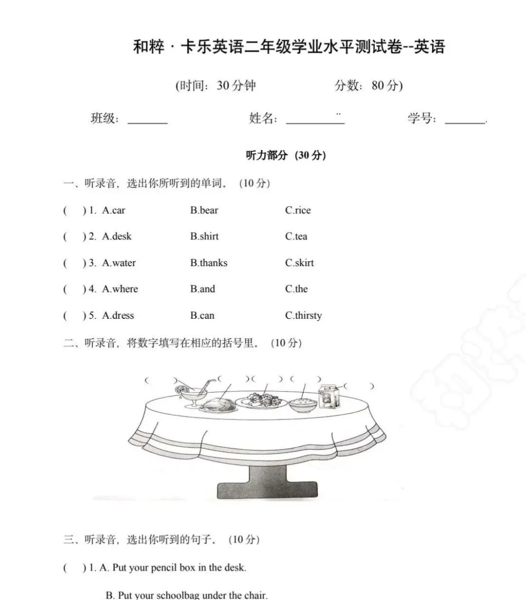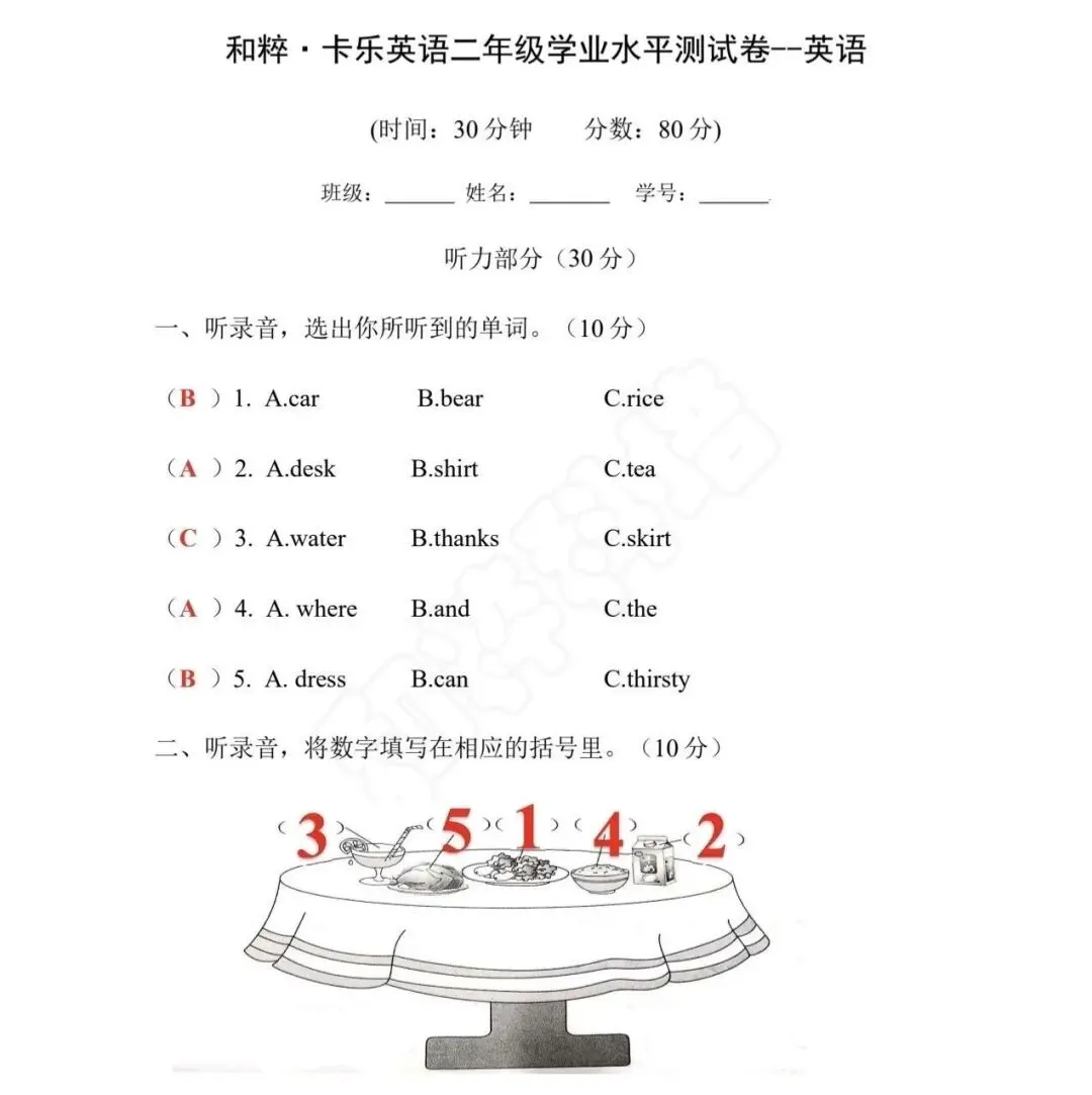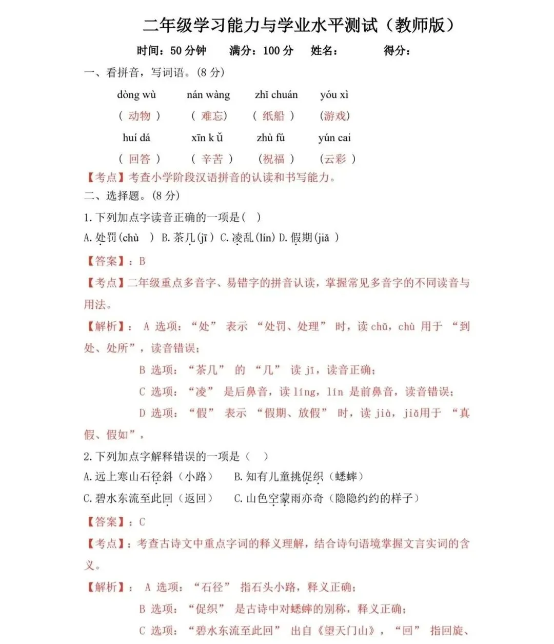 >二年级学业水平测试语数英试卷+解析+视频讲解