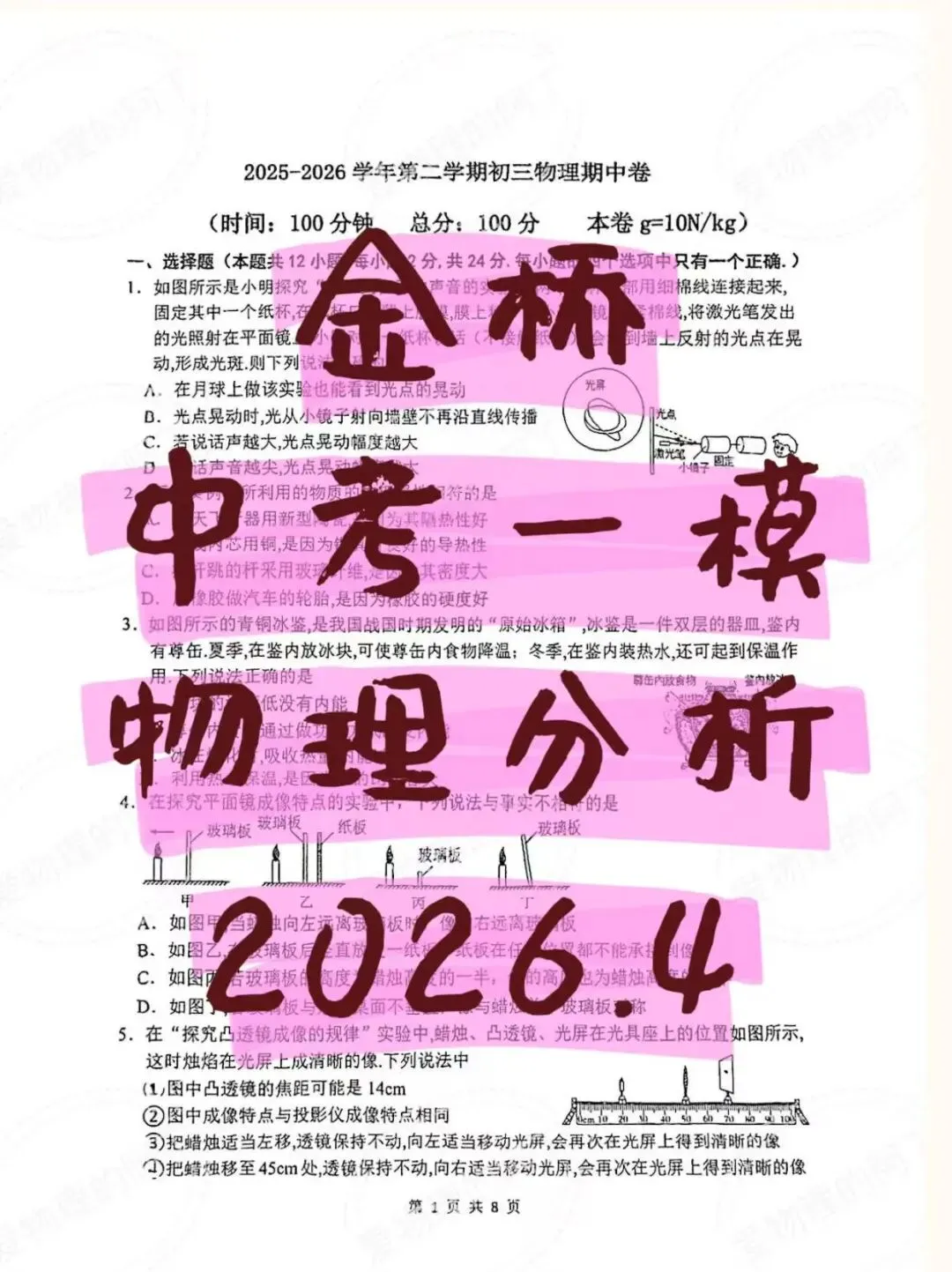 题目比较规整,像平面镜成像、凸透镜、滑轮组、船闸等都是高频经典题。