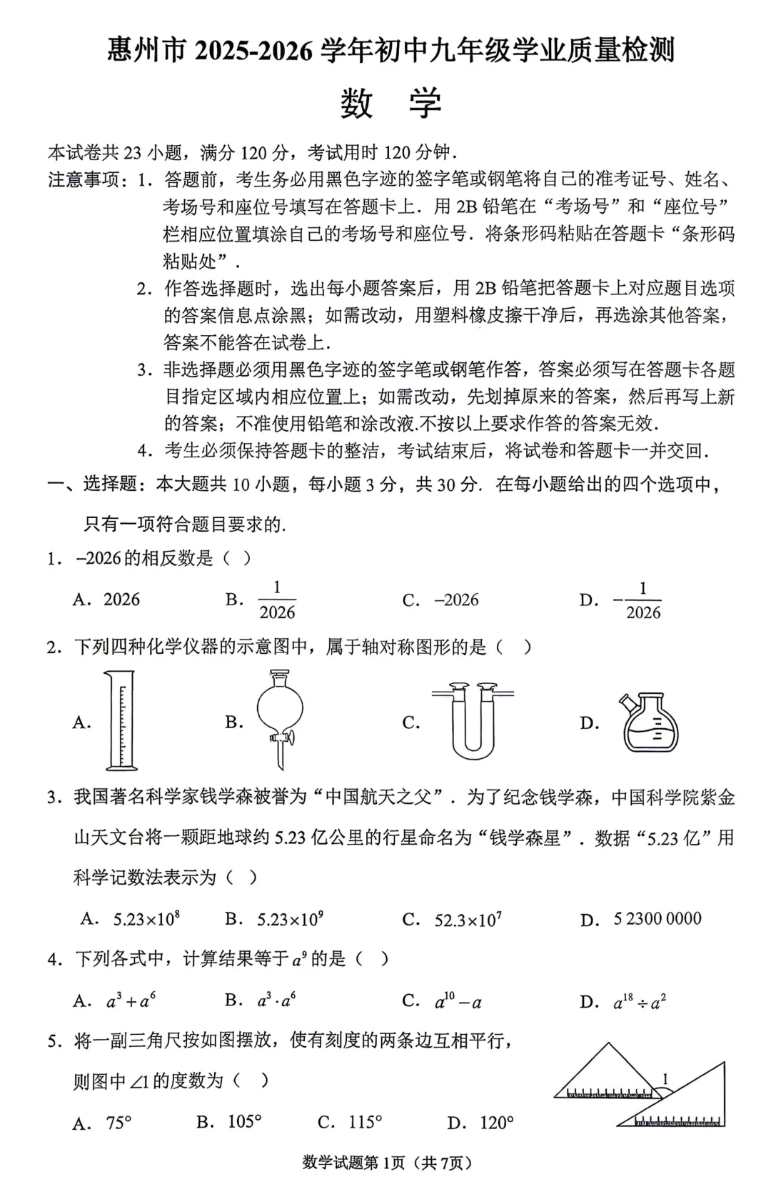 >2026年惠州模拟数学试卷(含答案)