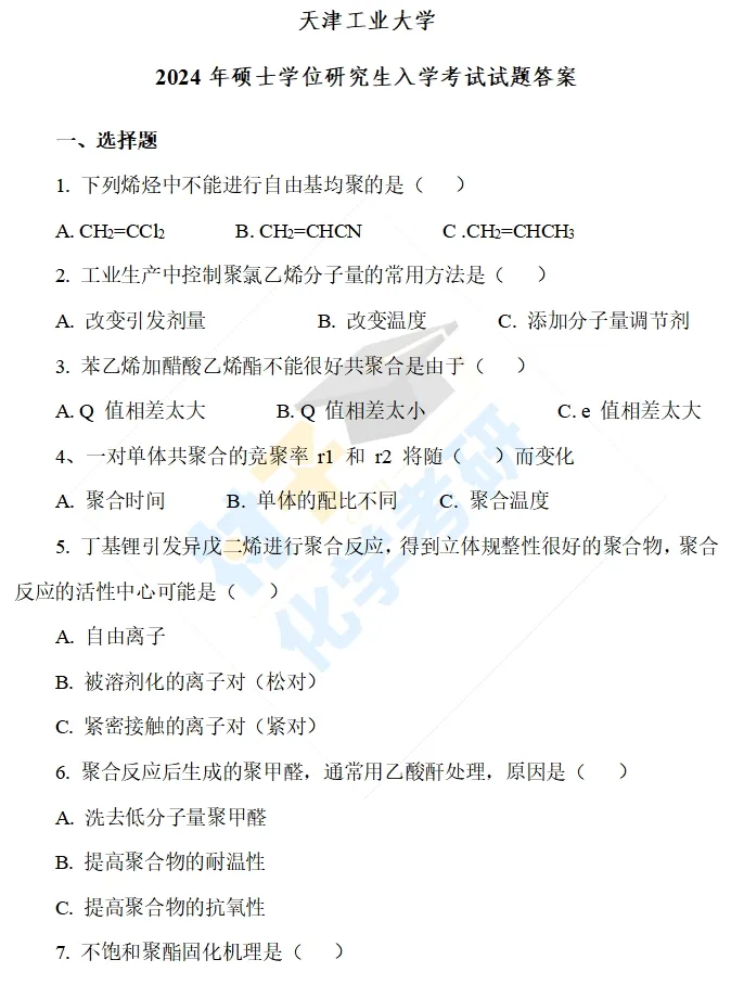 【考研真题】2024年天津工业大学(805高分子化学)真题公布