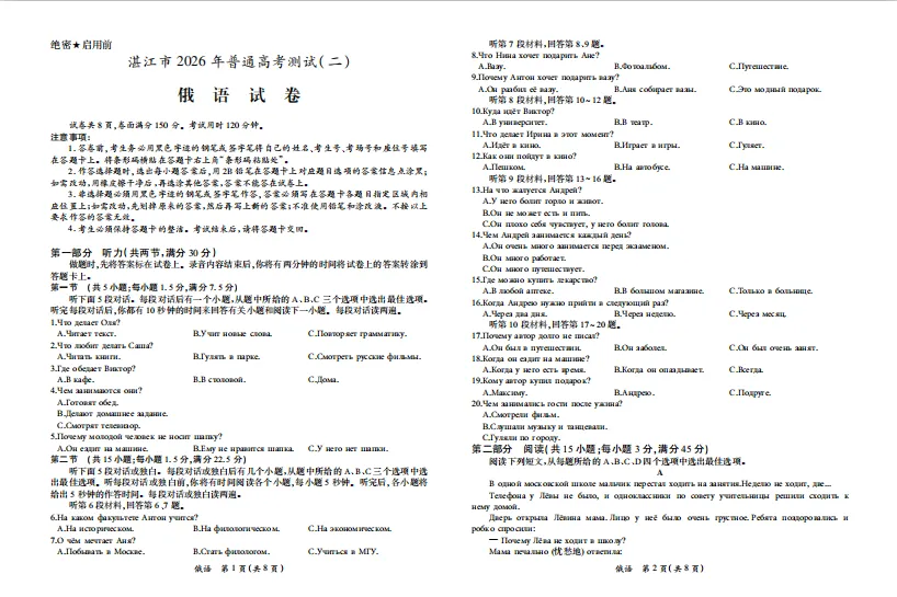 ✅ 俄语:试卷+听力原文+听力音频+答案+书面表达范文(听力选材围绕“人与自我”“人与社会”主题,贴合高考俄语命题规范)