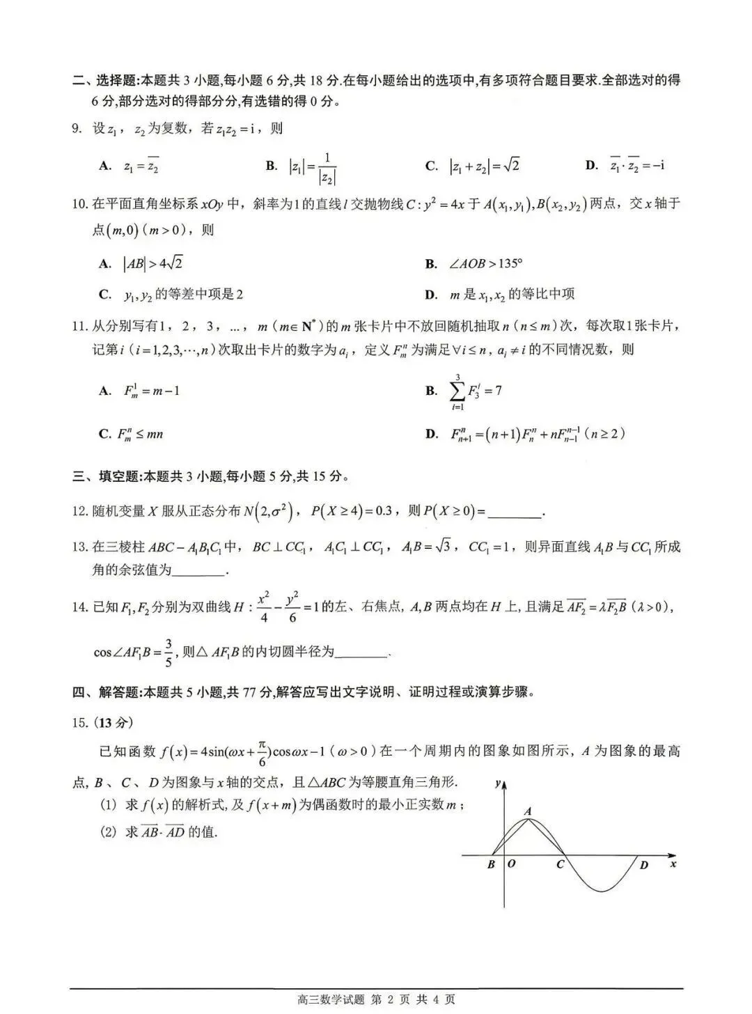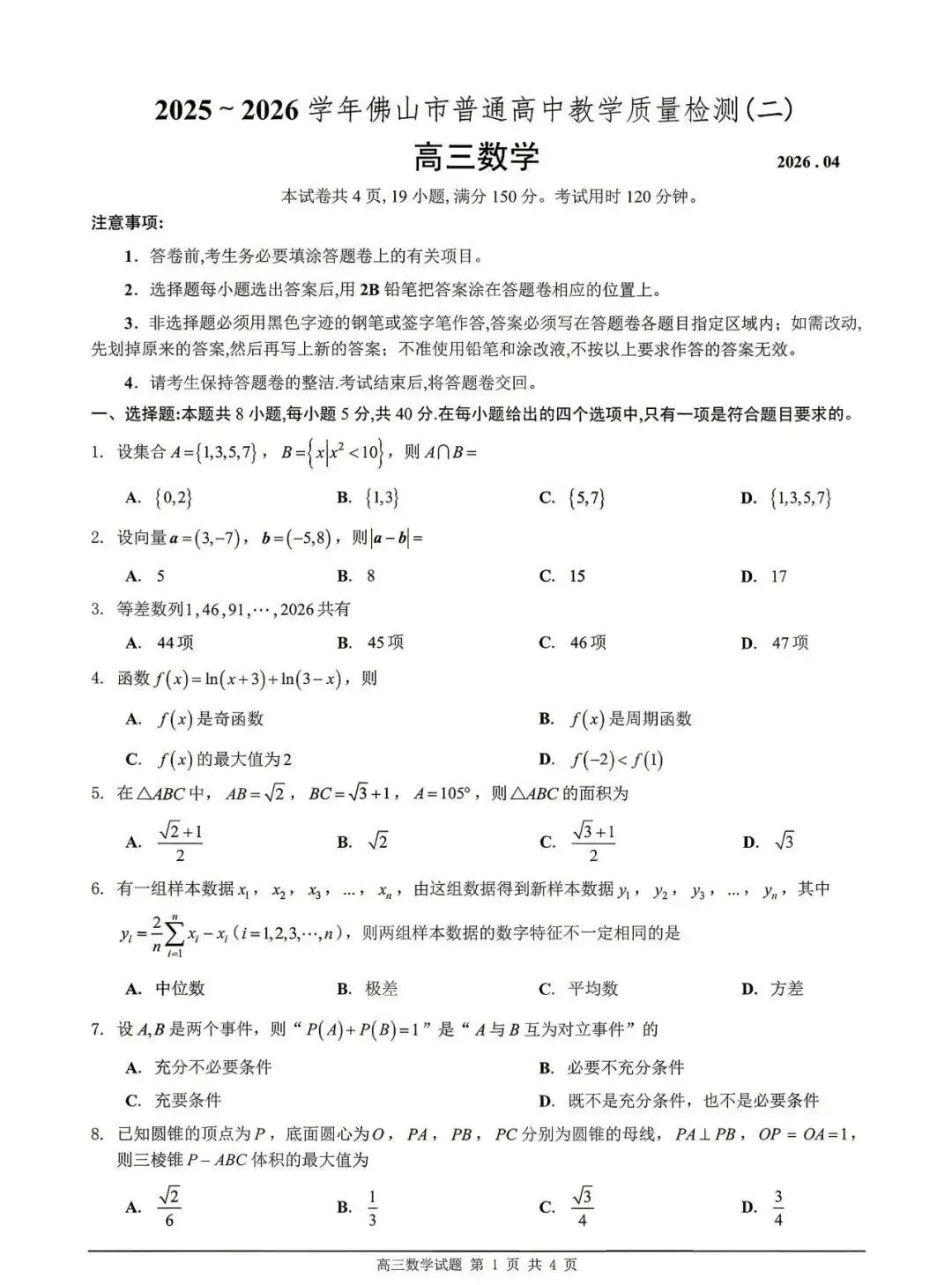 2026年佛山市高三二模数学试卷和参考答案