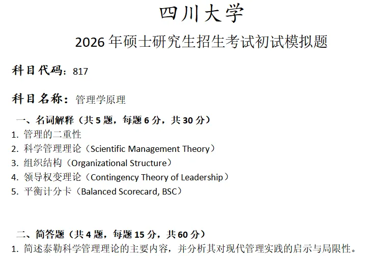 四川大学817管理学原理考研真题模拟