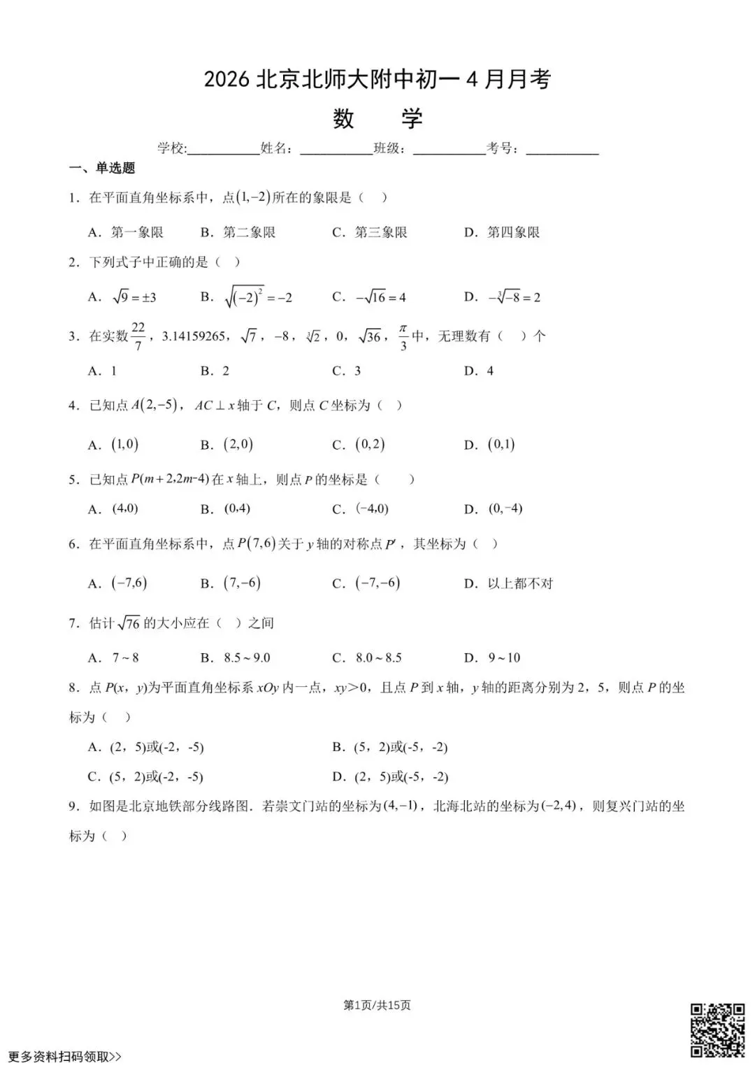 今天给大家分享的是2026北京北师大附中初一4月月考数学试卷(含答案),其他区域或学校的学生都可以练一练。近期会持续分享,欢迎大家多多关注,也可以把我们分享给更多人哦。