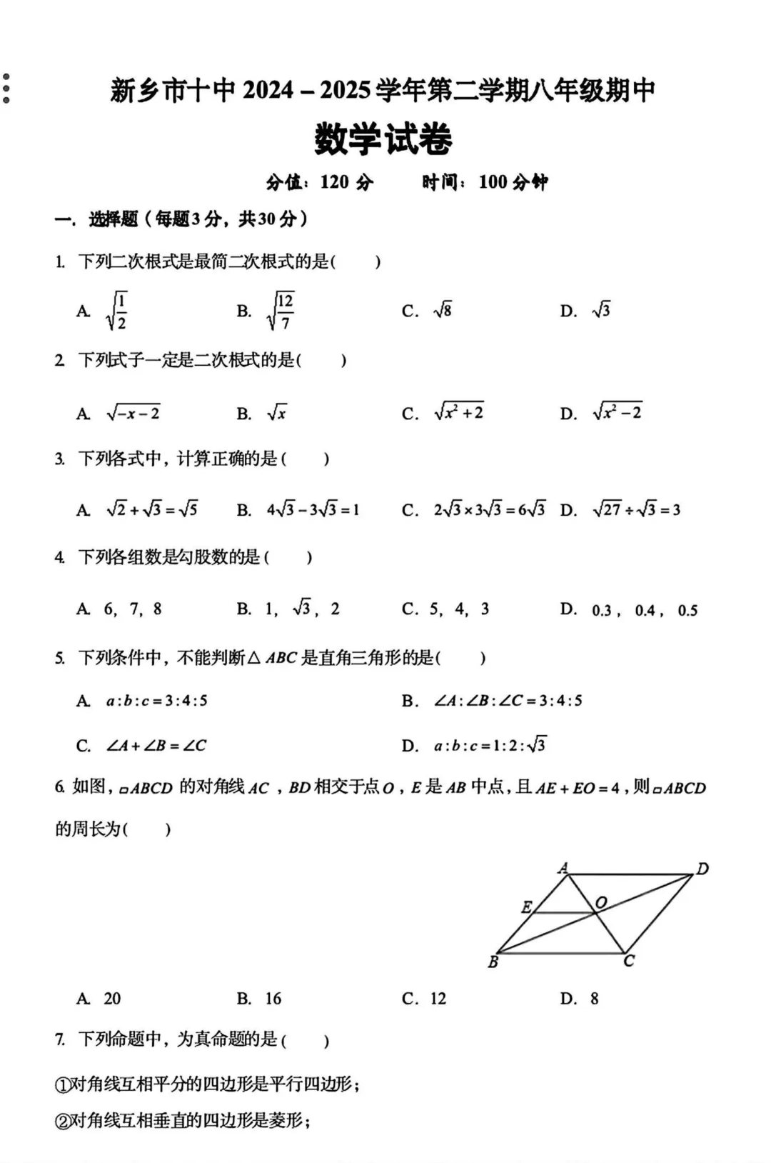 >新乡十中24-25学年八下期中数学试卷