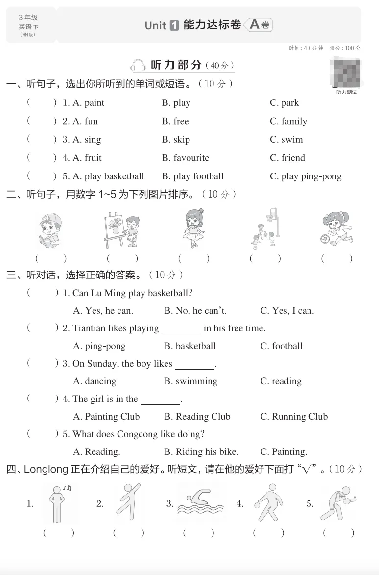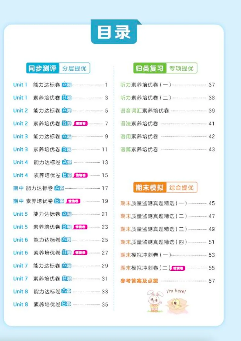单元卷每单元一套,紧跟学校进度;专项练习按题型分——听力、单选、情景交际、阅读全覆盖;期中期末卷难度贴近真实考试,考前刷两套,心里有底✅