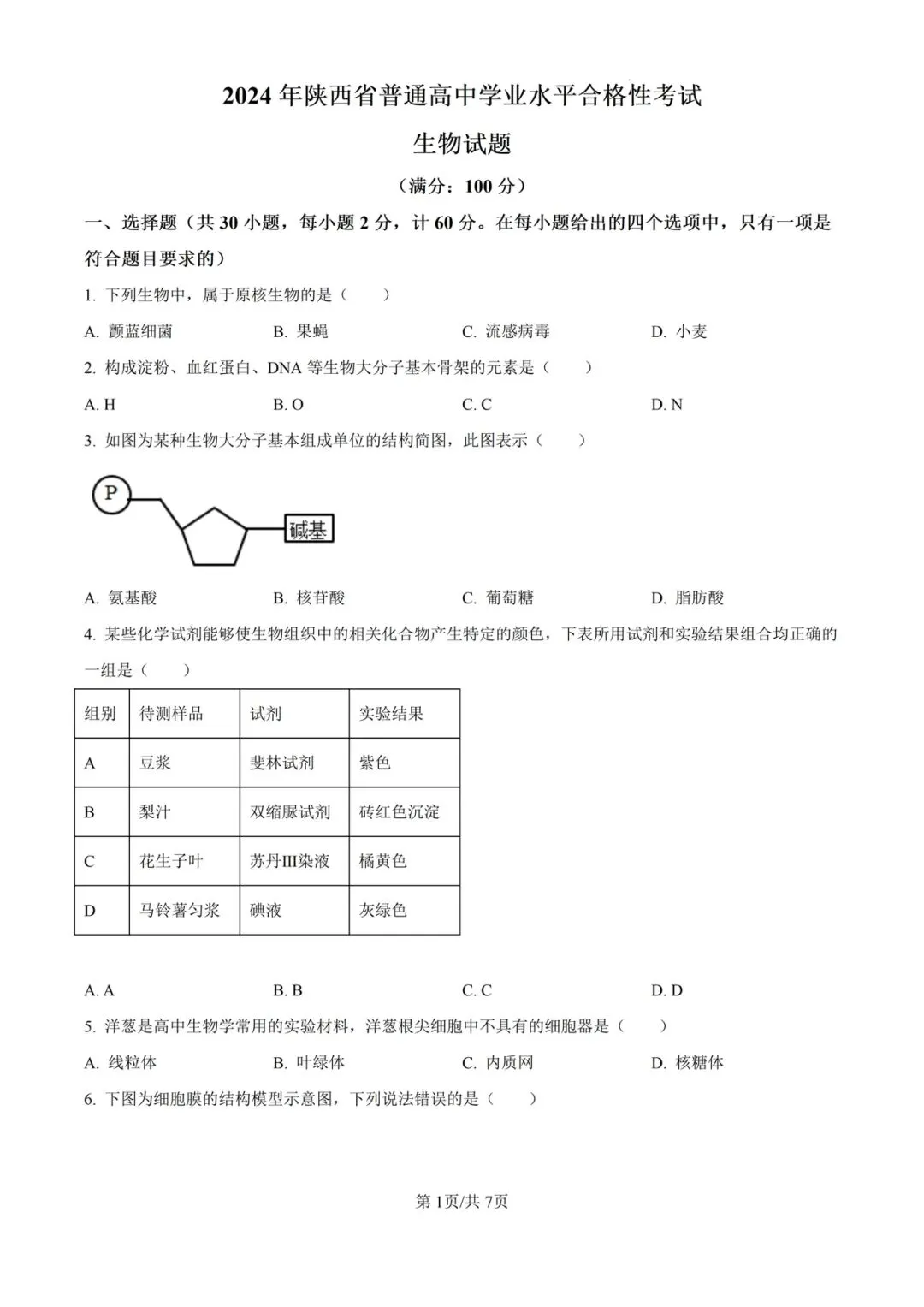 近5年陕西省合格考(学考)生物学试卷及答案解析