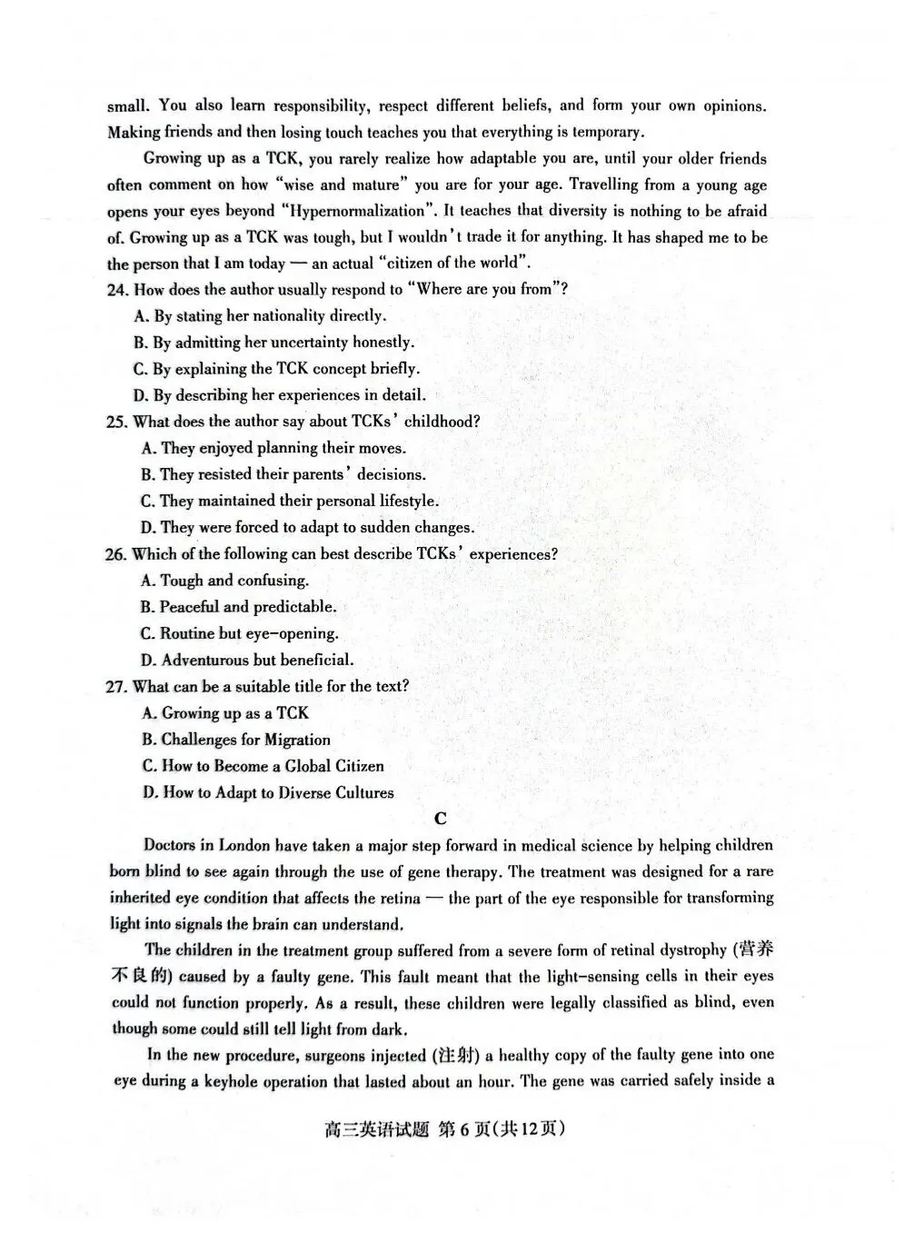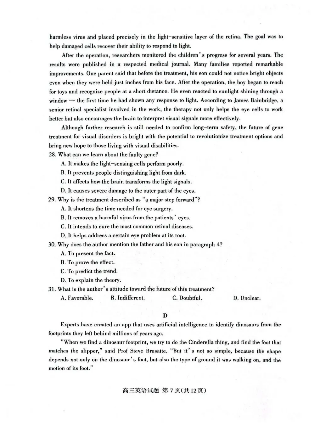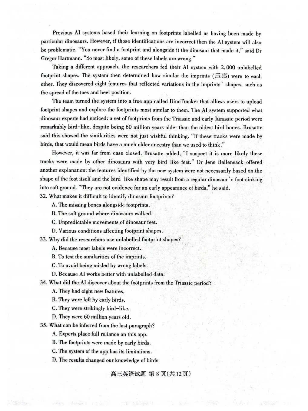 总体中等偏上,难度系数0.66,试卷梯度设置合理,简单题稳分、中档题练思路、难题控区分,对中等生极其友好,无断崖式难度,与2025新高考Ⅰ卷命题节奏高度一致,选材同频,话题紧跟高考:AI、基因治疗、环保、乡村振兴、跨文化。适合90–125分主力分段,用于巩固基础、梳理思路、规范答题;对目标130+学生,可用于练速度、抠细节、减少失误。整体是一份高质量、强对标、可直接用于二轮冲刺的模拟卷。