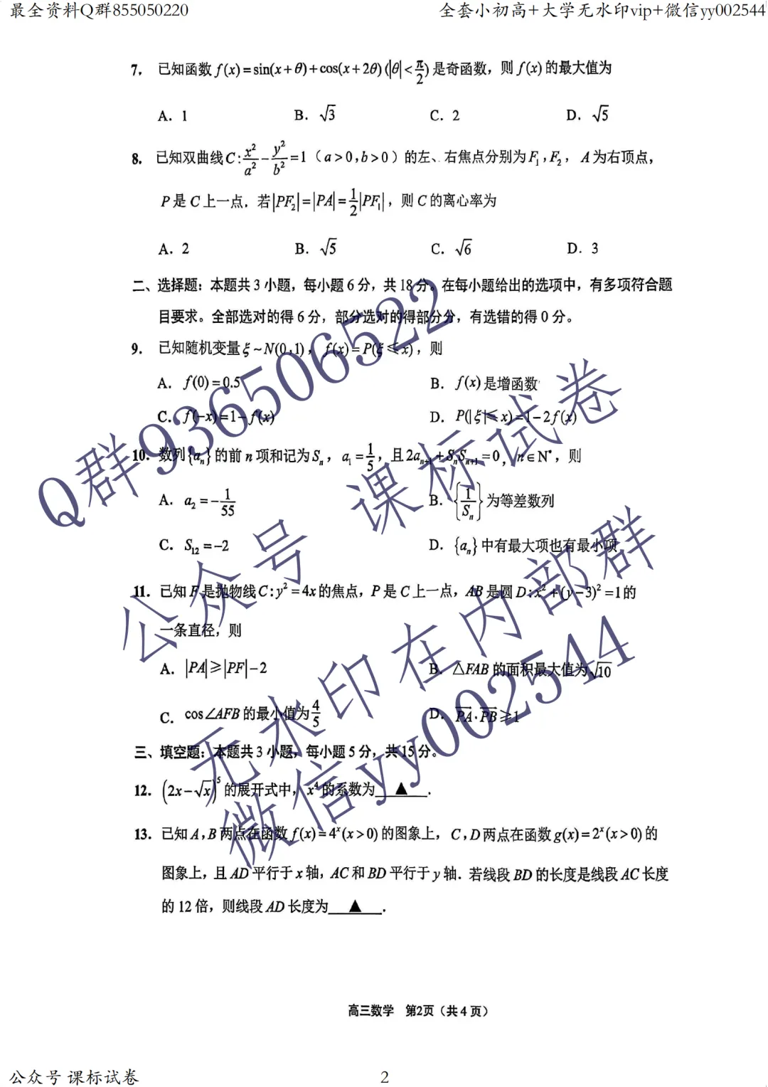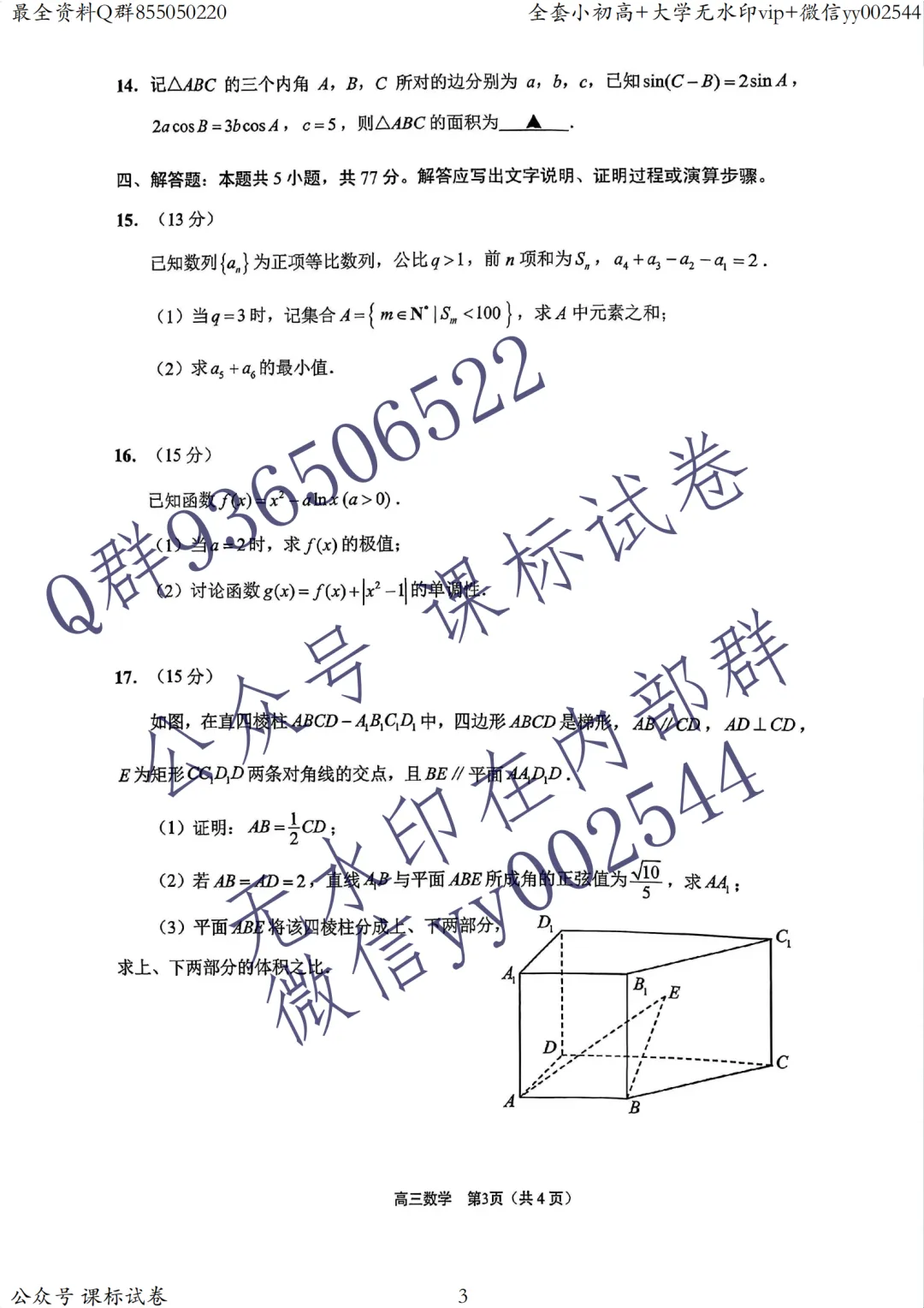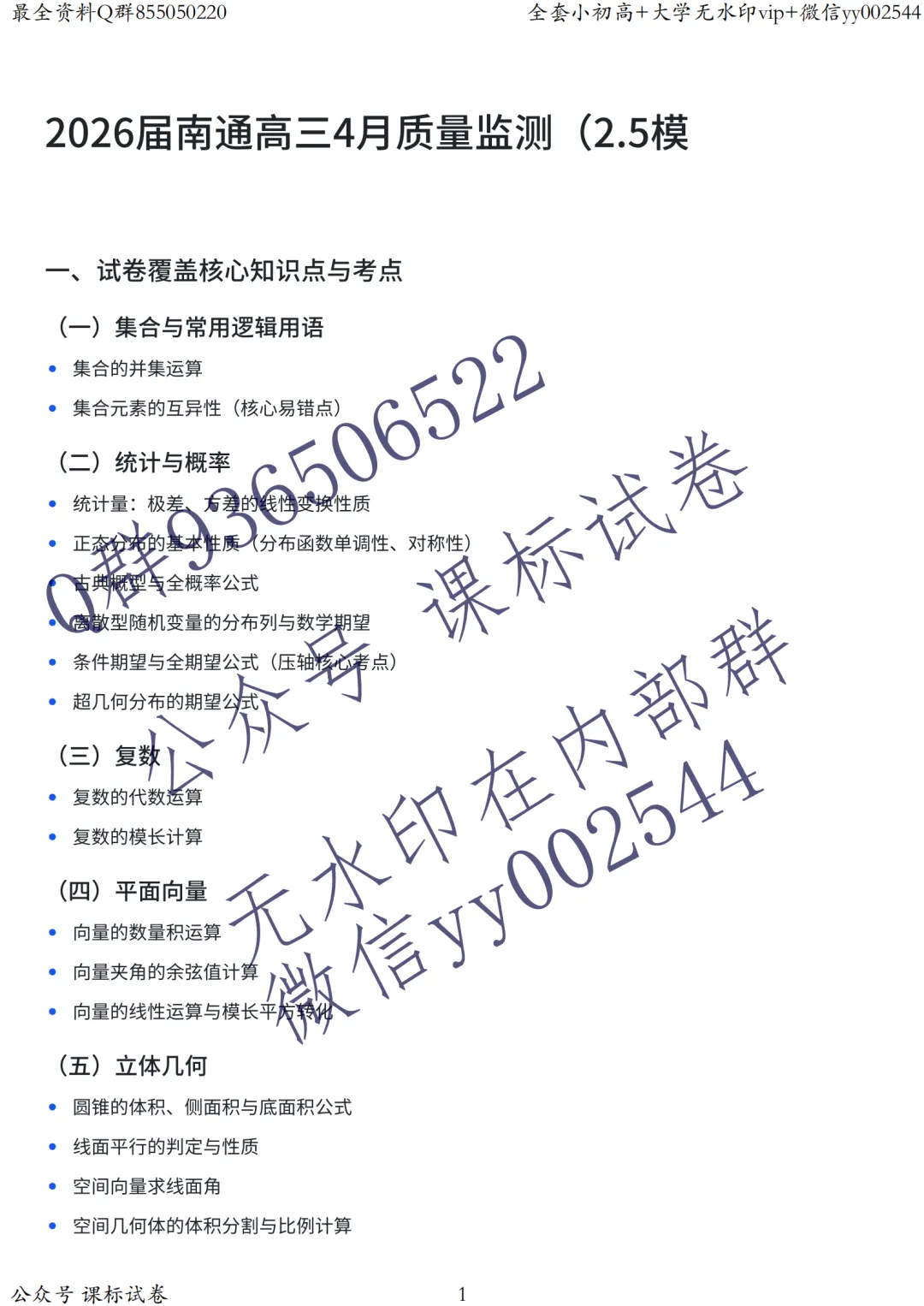 >数学知识清单+备考指南+试卷+解析!南通徐州江苏基地大联考南通2.5模高三联考!
