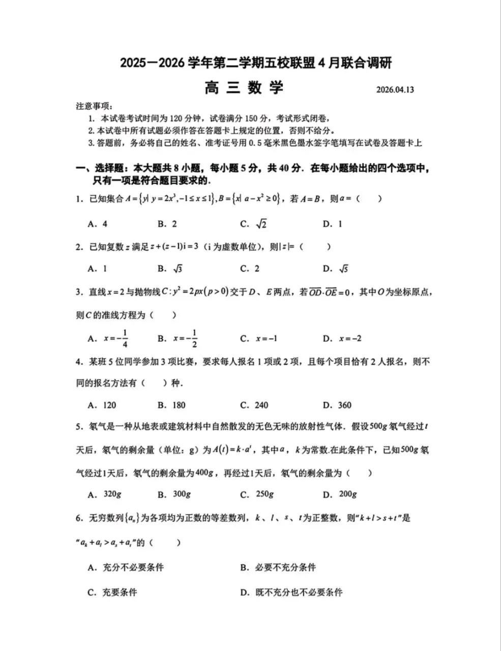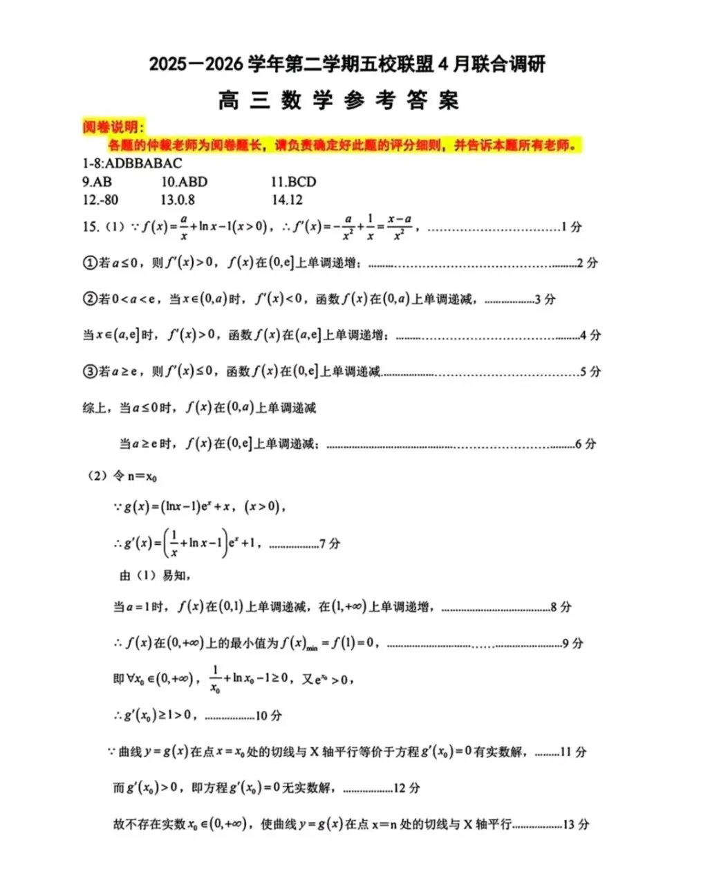 今日分享:2026届南京五校联盟高三4月联合调研试卷+答案