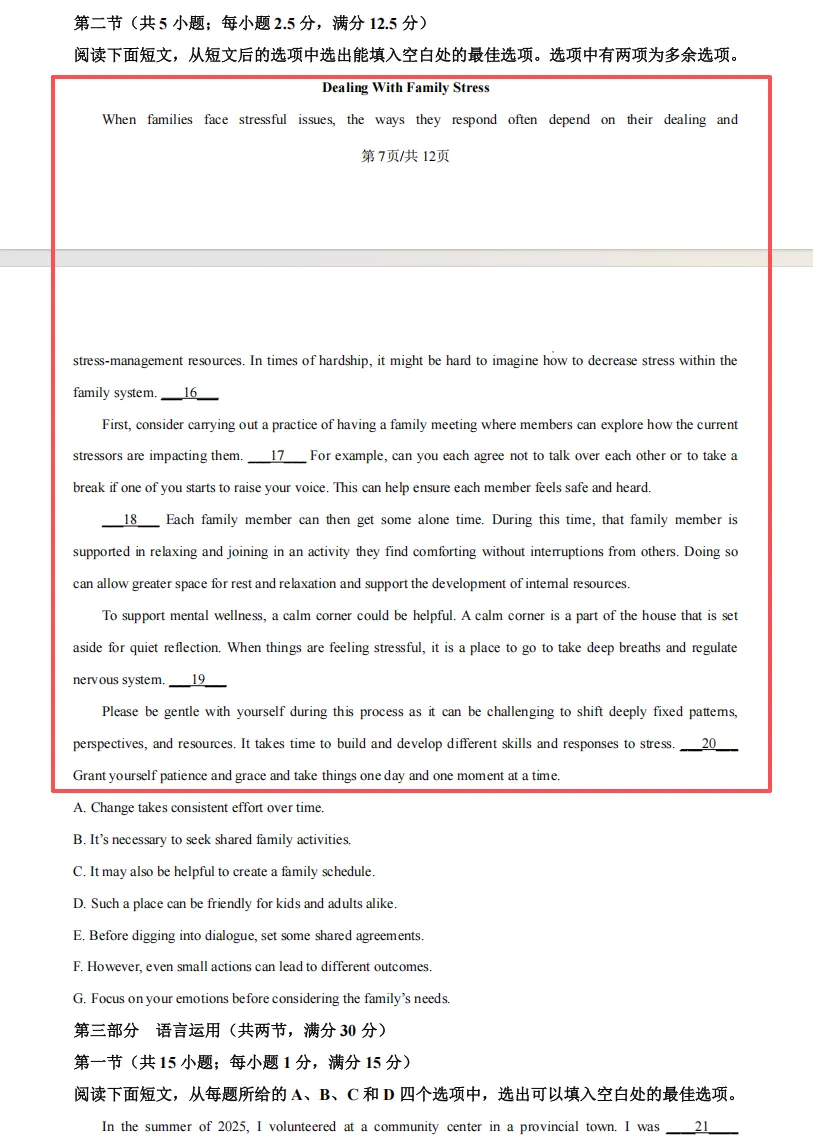 时代热点 + 语境运用,读写难度略升。选材贴合环保热点、社会现象、人文成长。完形与阅读注重语境逻辑,语法填空聚焦时态、从句、非谓语,书面表达偏向 “现象分析 + 观点论述”,对词汇量与长难句分析能力要求更高,贴合新高考II卷命题趋势。