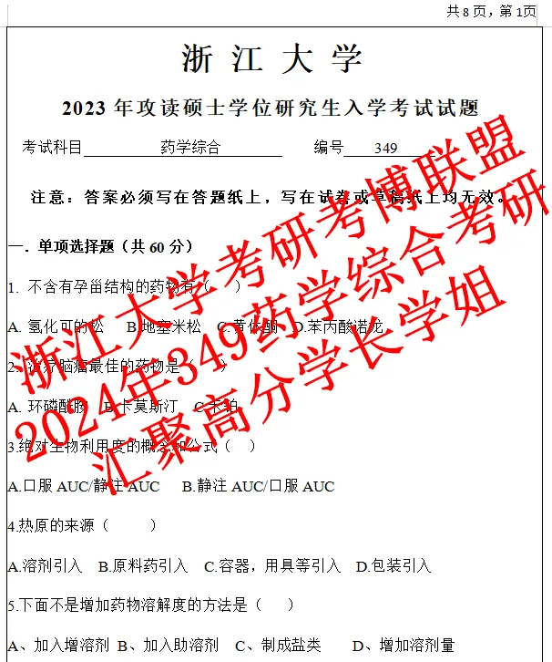 4.最新收集到2023年349药学综合考研真题,包含60个单项选择题,多项选择题20题,大题18个都已经收集到位,全份试卷包含了整整8页