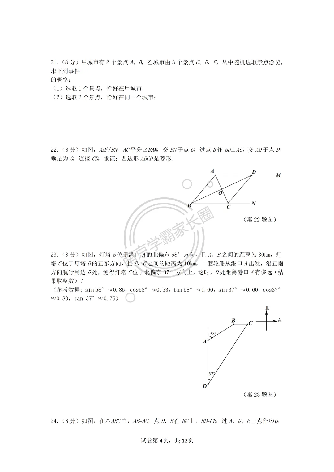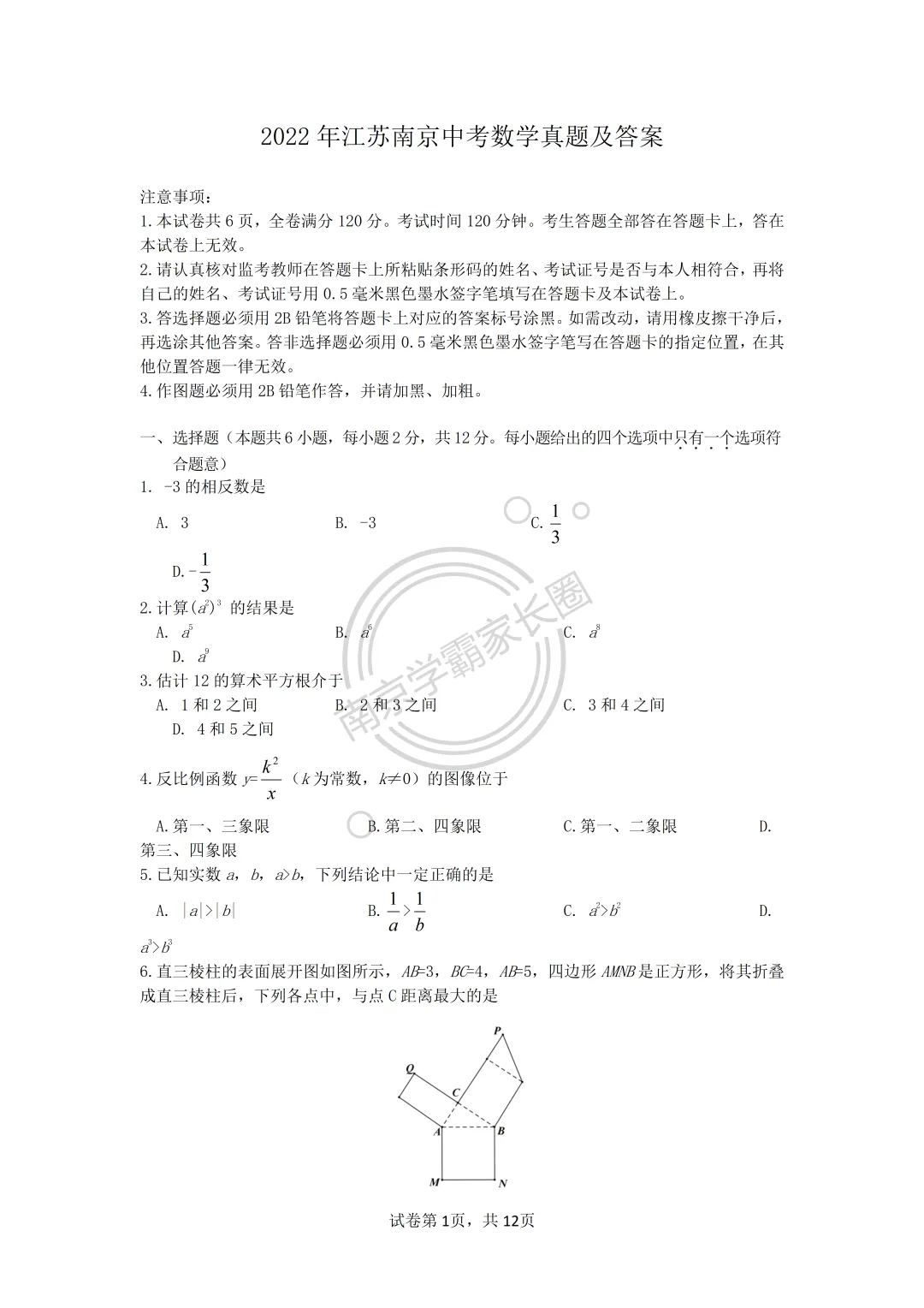 今日分享:南京2022年中考数学试卷,可打印完整版!