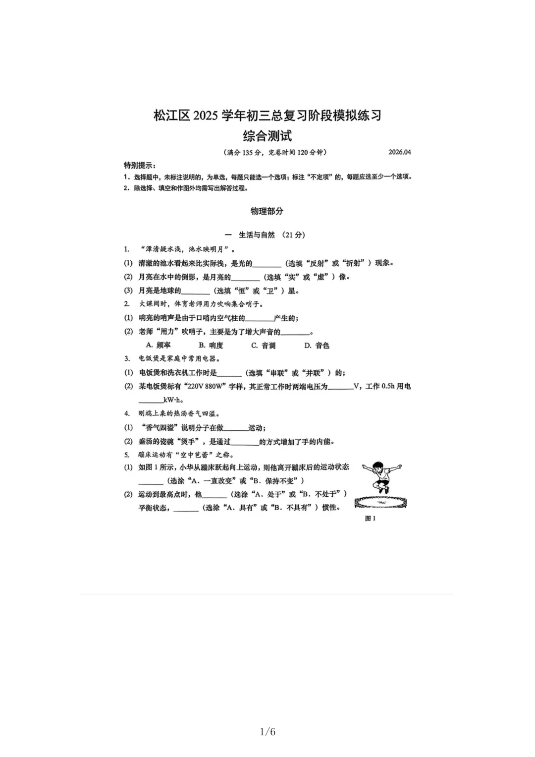 >2026年上海松江初三二模物理试卷及标准答案