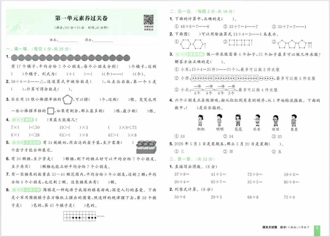 26春新版《拔尖大试卷》1-6年级数学人教版下册,含有答案!