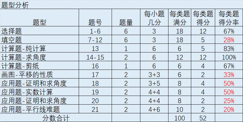 通过题型分析,我们还可以知道,学生是几何能力强一些,还是代数能力强一些。也让孩子对自己有信心,因为一定有他做的好的题型。
