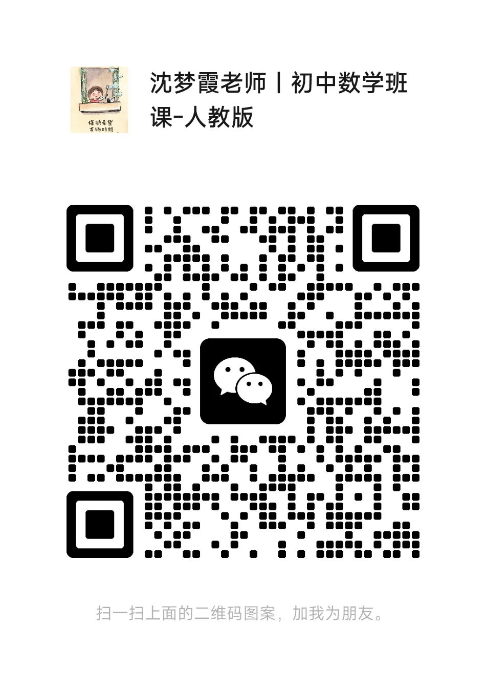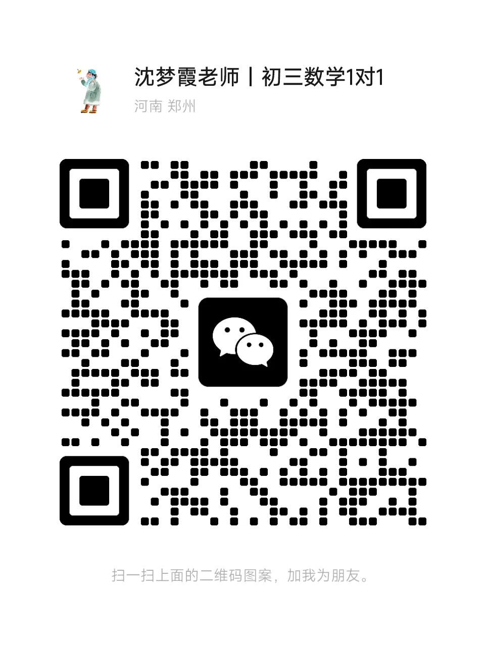也欢迎大家多多转发到朋友圈、微信群、家里有学生的朋友,你的一次转发,就可以帮助他多掌握一些方法和资讯,少走一些弯路。你家孩子,数学遇到的困难是什么呢?欢迎找我聊聊。添加请备注学生几年级,数学用的什么版本,目前多少分,否则不通过,请谅解。更多学习方法、做题习惯、要避免的坑,识别下方二维码查看。