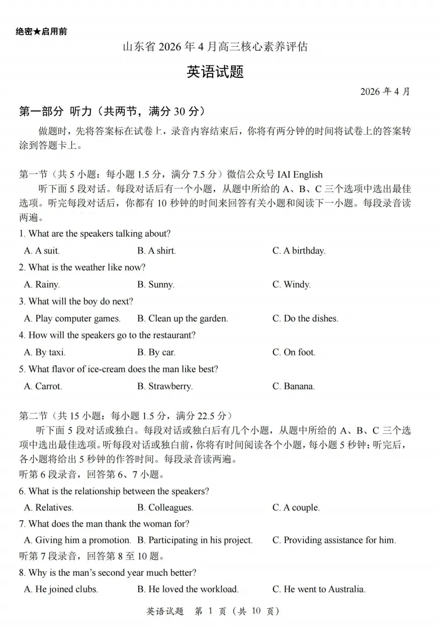 >【试卷推荐】2026年4月山东省高三核心素养评估英语试卷及答案详解