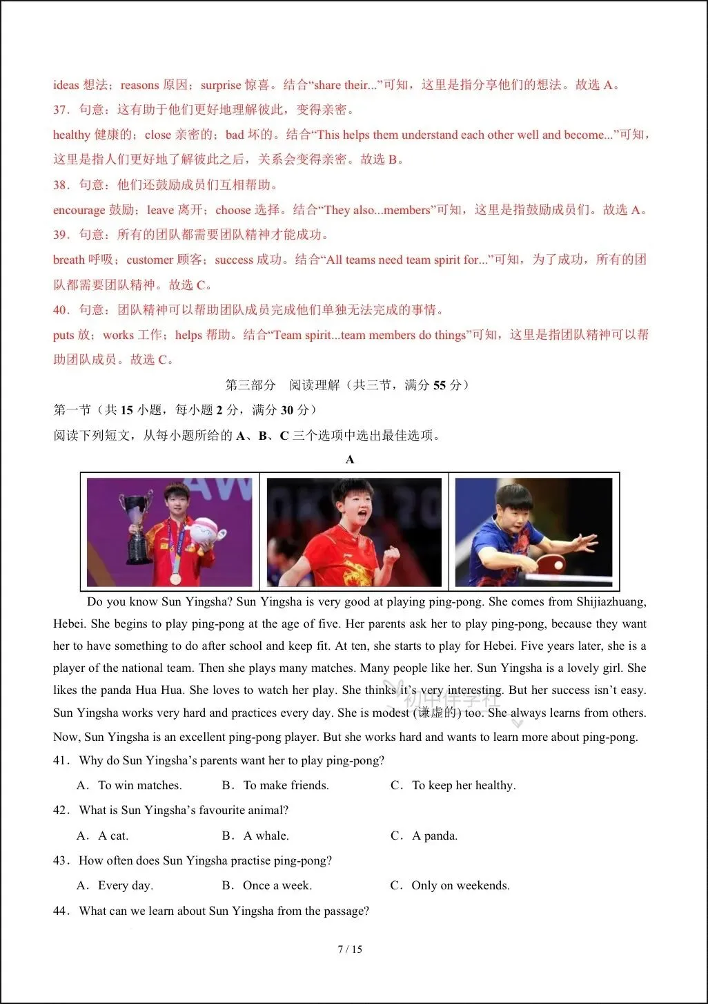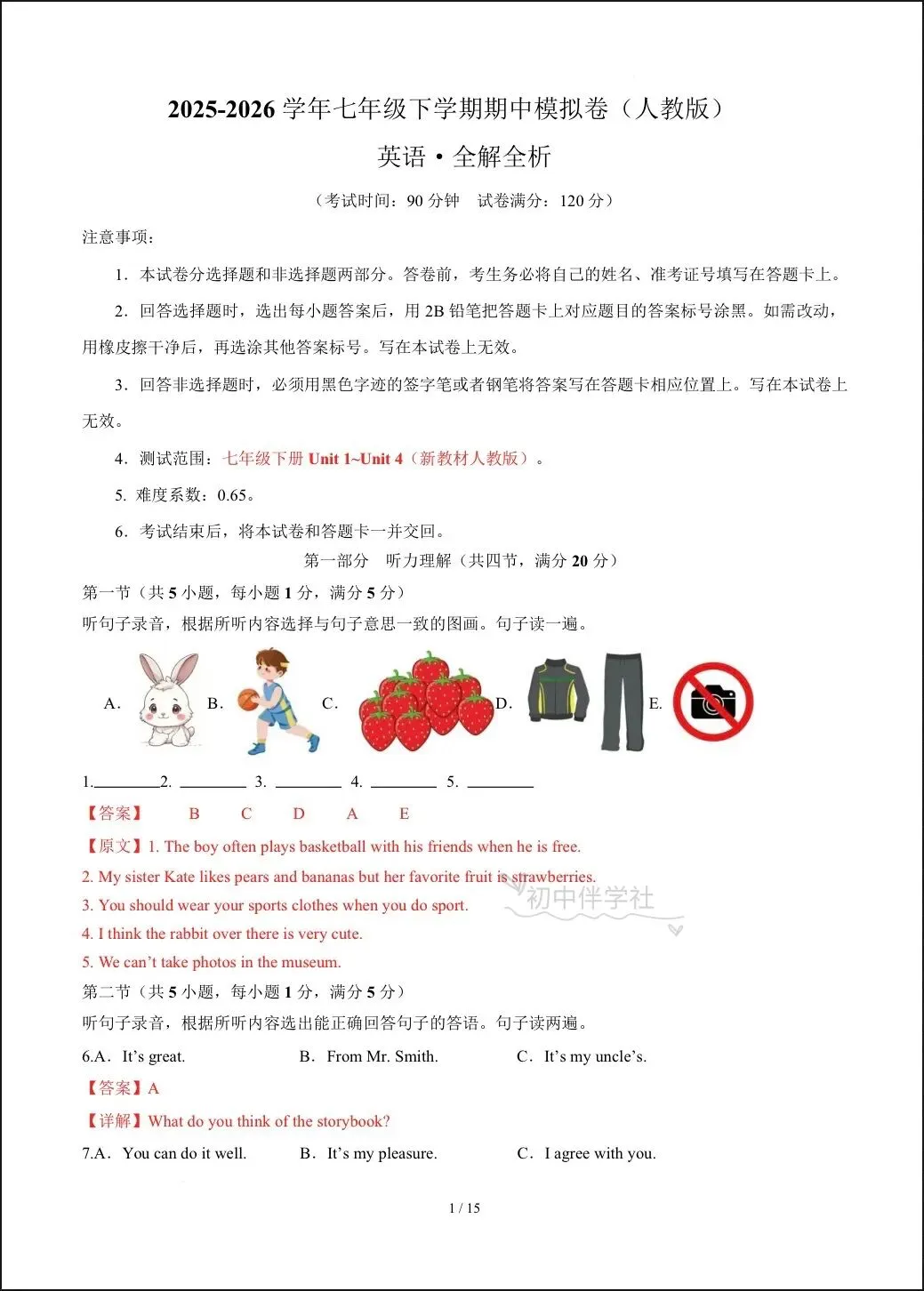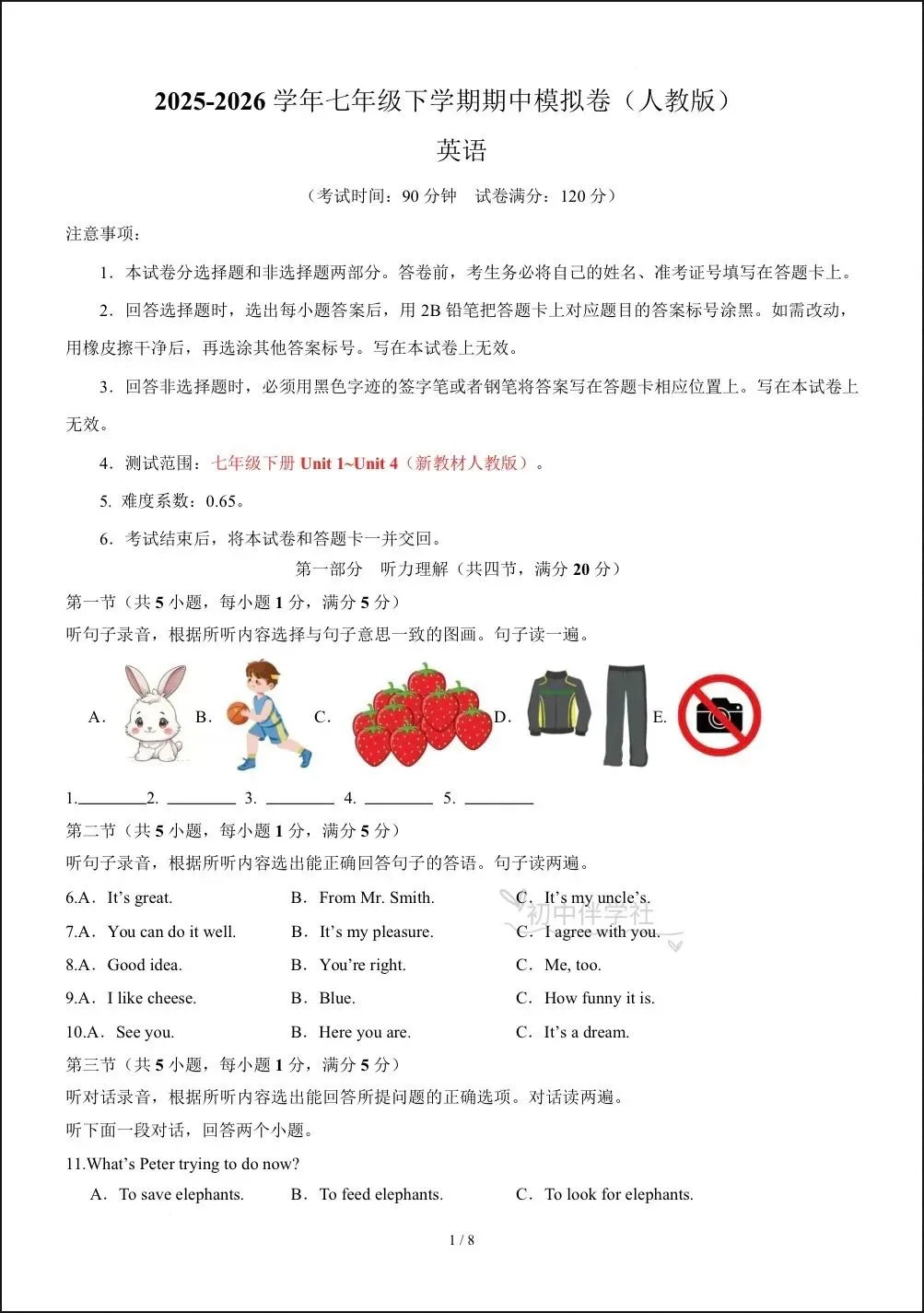 2026春人教版七年级下册英语期中试卷(有答案),电子版可打印可下载!①:点一点右下角的“赞”和“在看”,感谢
