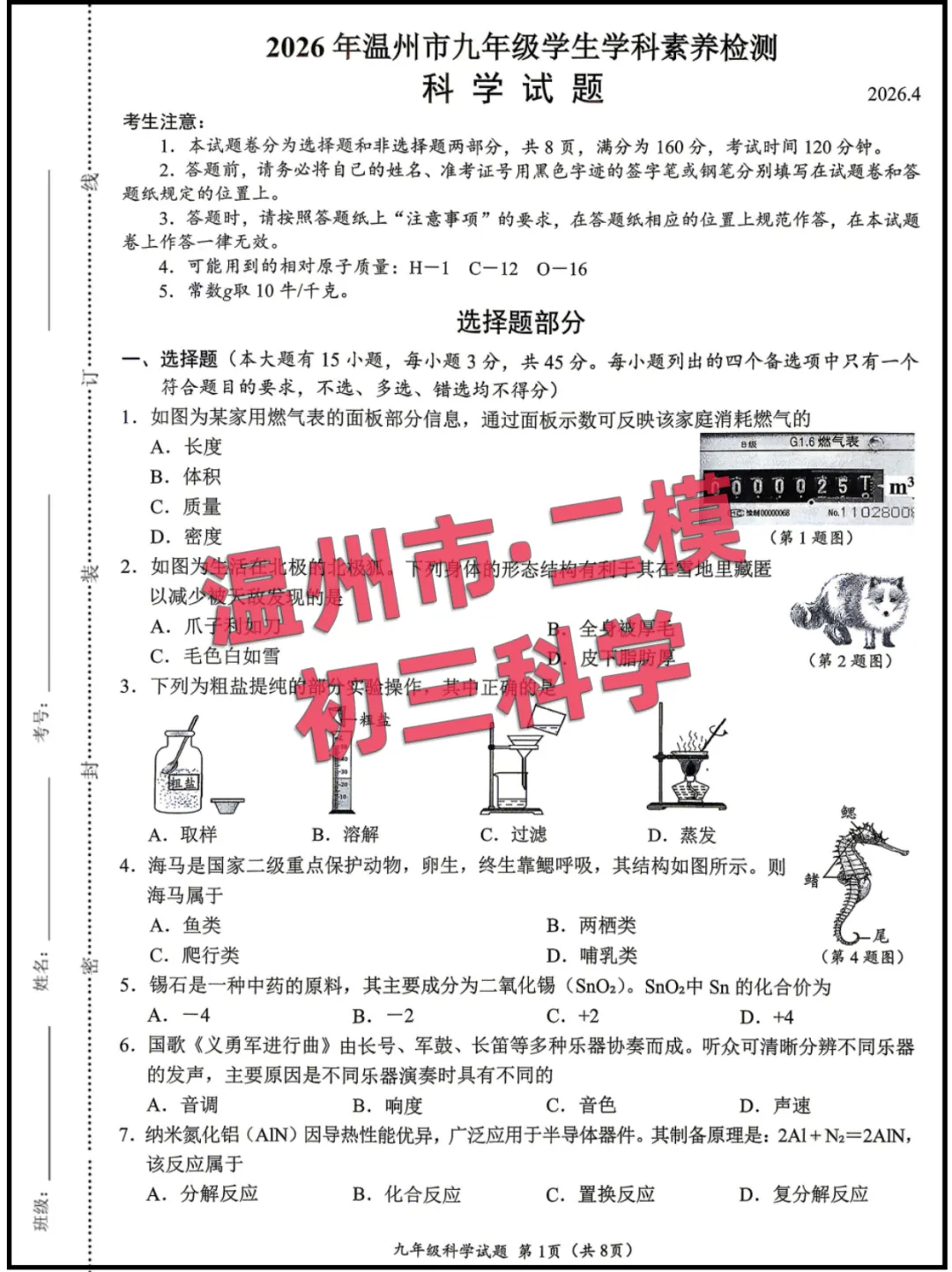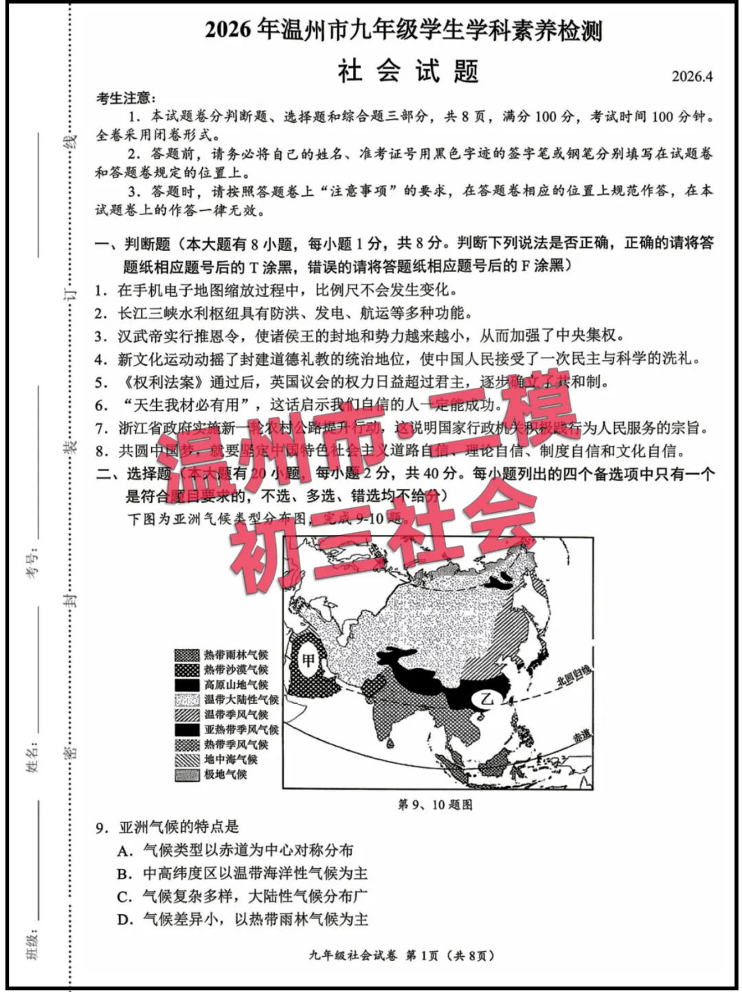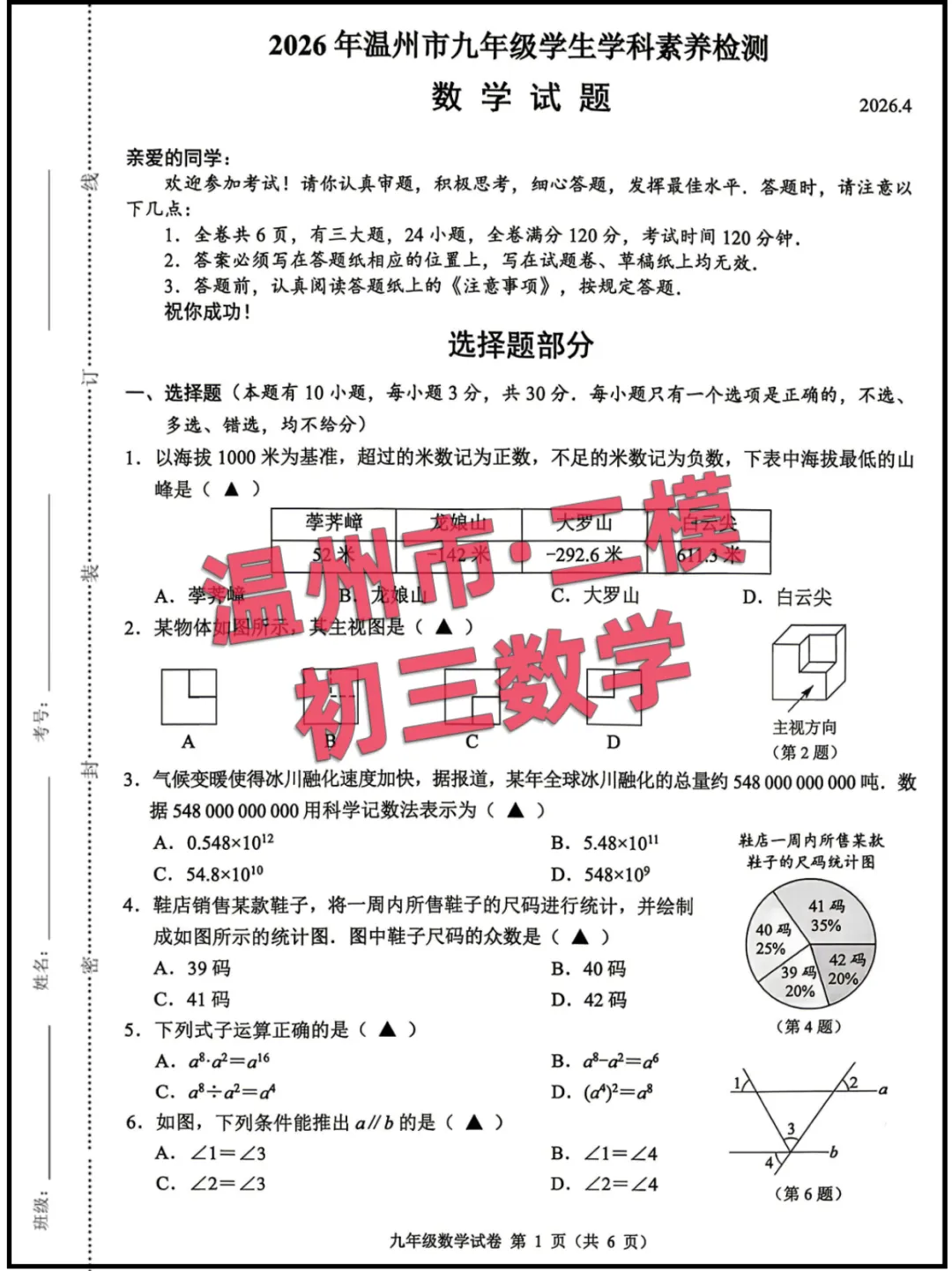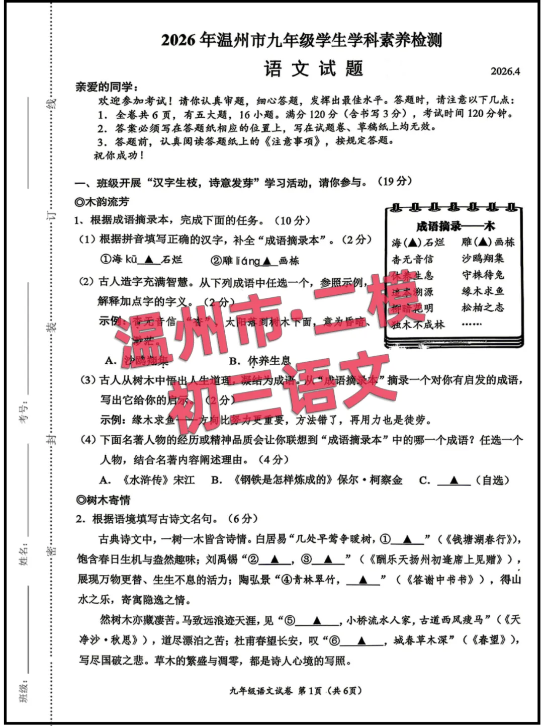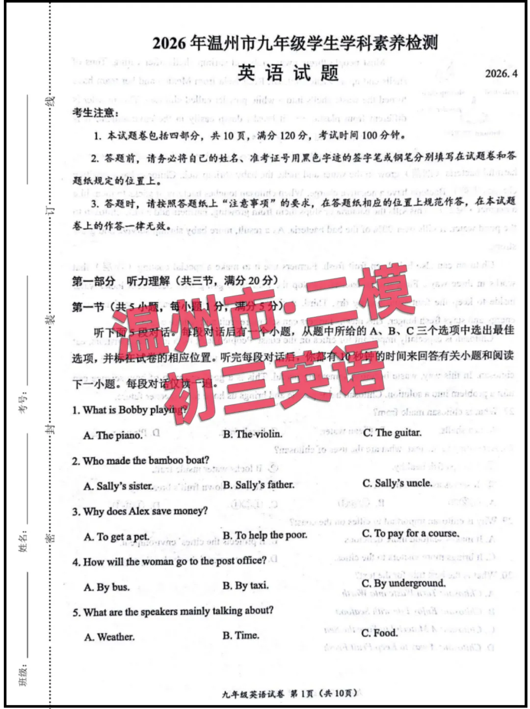 温州初三二模试卷及答案,是中考冲刺核心备考资料。试卷贴合中考命题方向,对照答案可精准复盘错题、补齐知识漏洞,结合区排名定位自身水平,为志愿填报和最后阶段针对性复习提供重要参考。