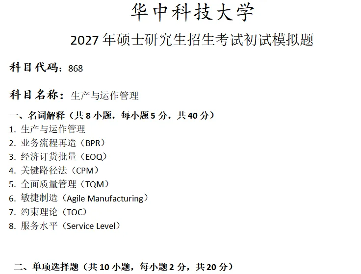 当前位置:首页>考研真题>华中科技大学868生产与运作管理考研真题模拟