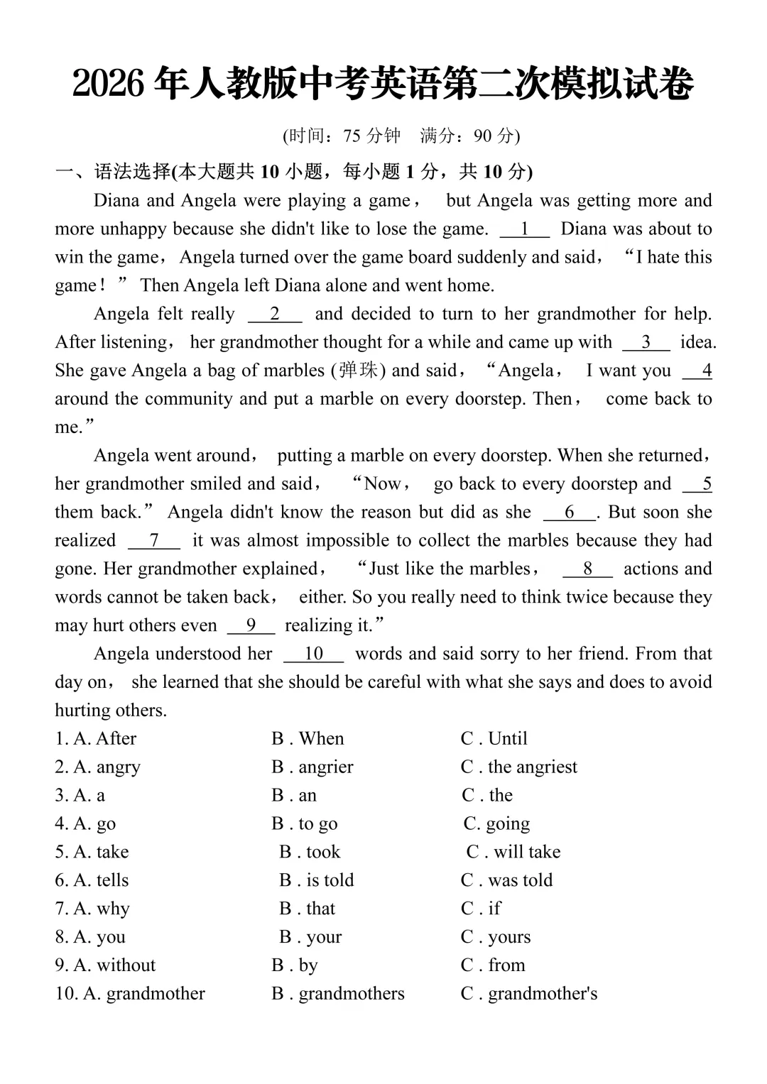 2026年人教版中考英语第二次模拟试卷(含答案),难度适中,可打印!抓紧练习!