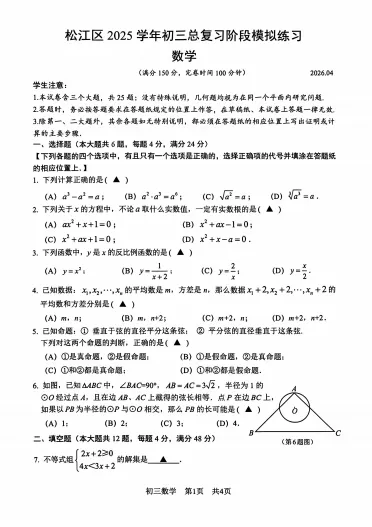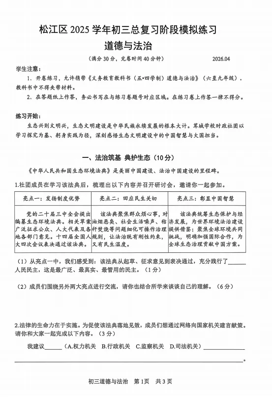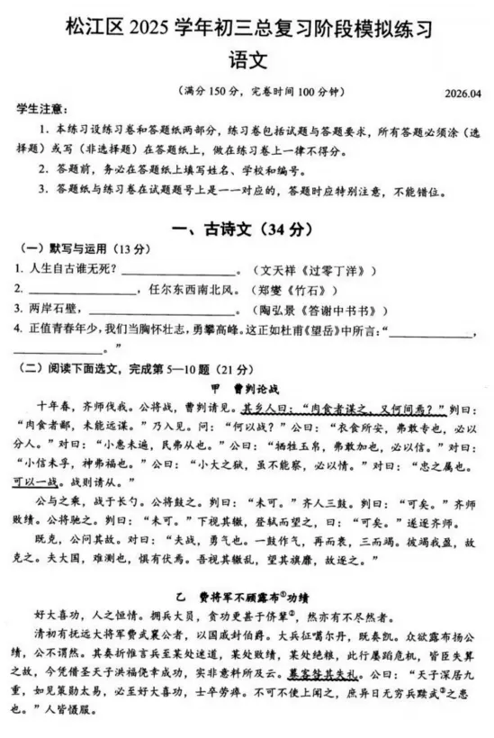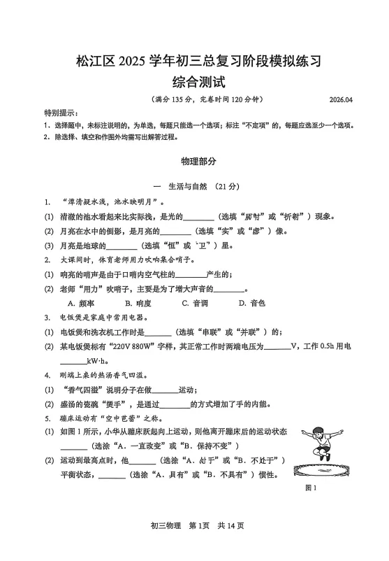 2026年上海松江二模试卷及答案汇编