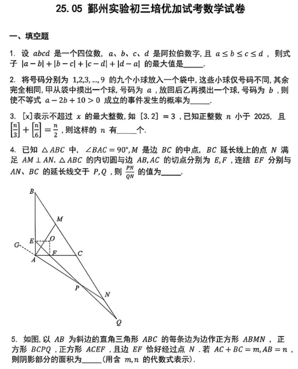 【浙江培优数学试卷】2025.5宁波市鄞州实验初三培优加试考数学