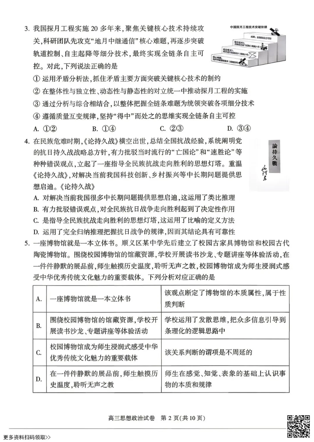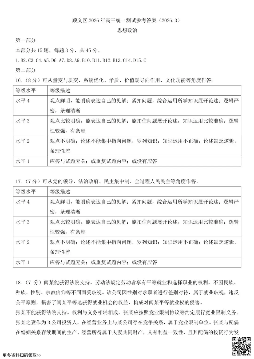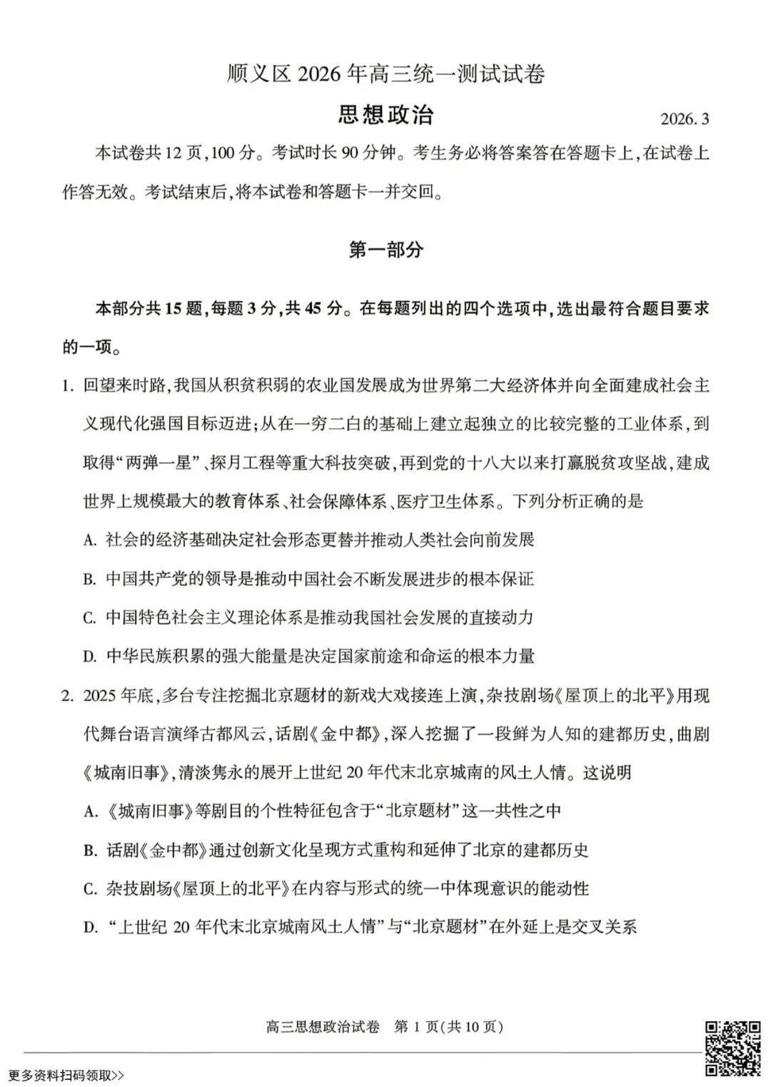 今天给大家分享的是2026北京顺义高三一模政治试卷(含答案),其他区域或学校的学生都可以练一练。近期会持续分享,欢迎大家多多关注,也可以把我们分享给更多人哦。