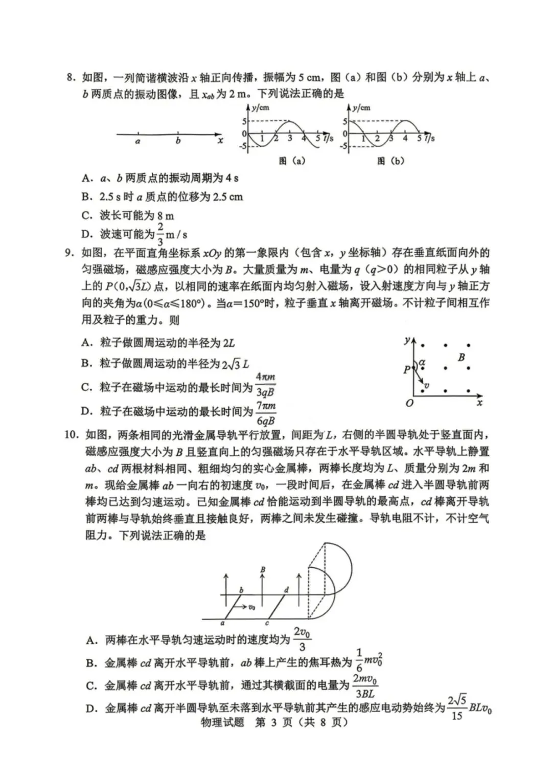 • 难易度与解题关键:中等。关键点在于利用相距 2m 的两个质点 a、b 的振动状态,列出距离与波长的关系式 Δx = (n + 3/4)λ (基于波沿 x 轴正向传播),从而求出可能的波长和波速。