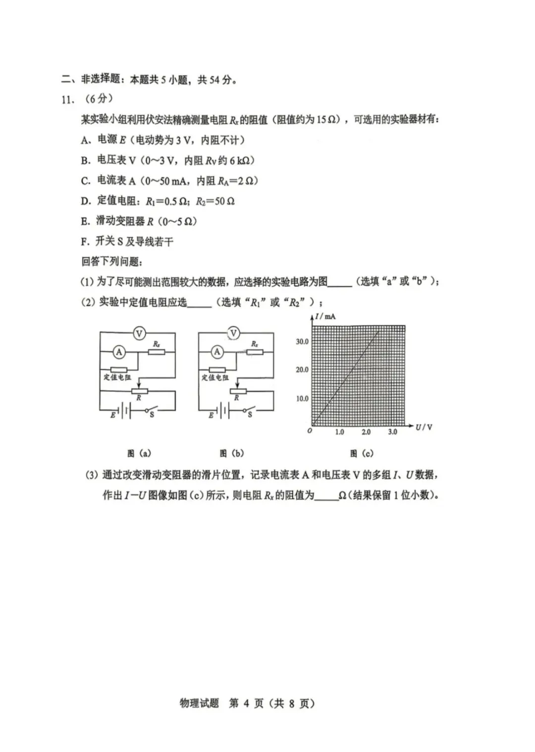 • 难易度与解题关键:中等。关键在于器材选型(滑动变阻器分压式接法)以及根据图像斜率计算电阻。电表内接导致测量值包含电表内阻,需要剔除。