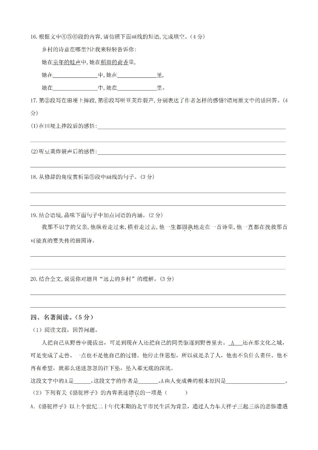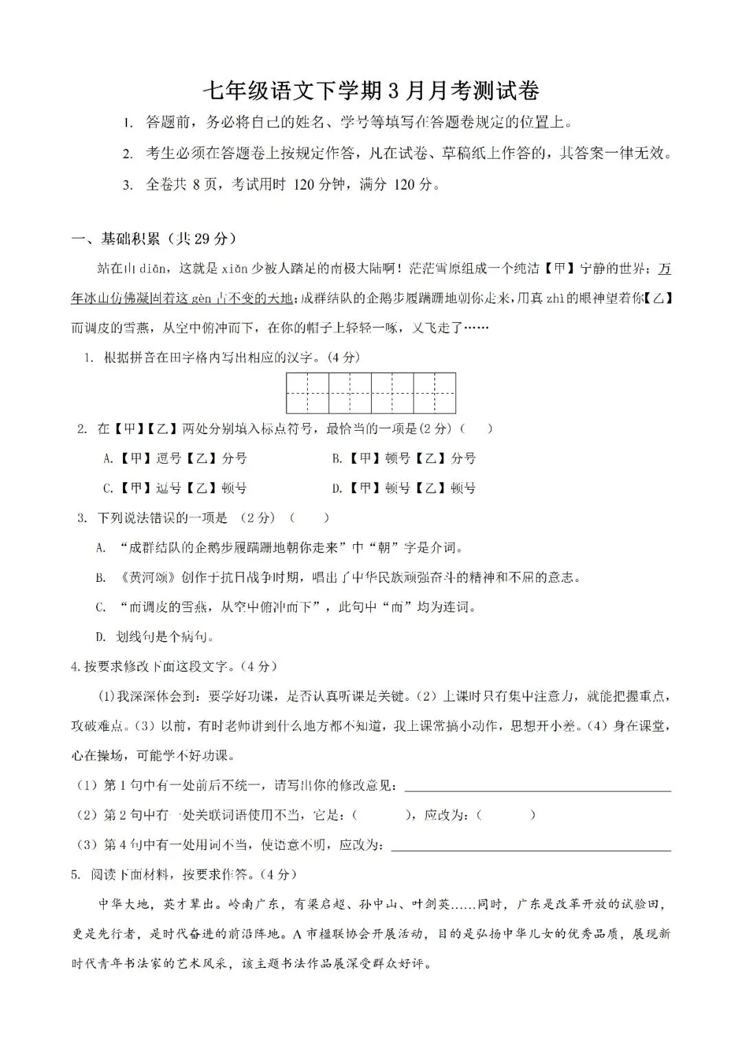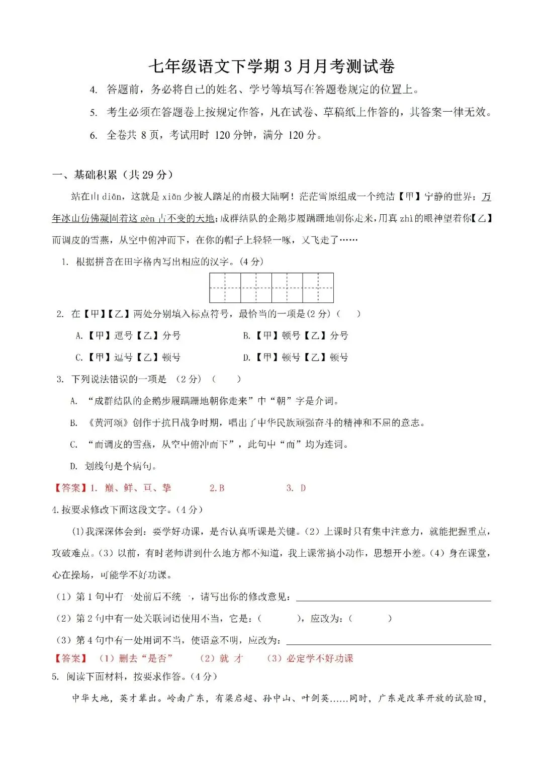 新七年级下册数学湘教版期中试卷(答案+答题卡)完整电子版可打印