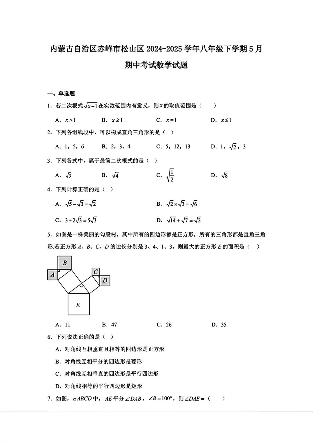 >数学期末试卷|赤峰市松山区2024-2025学年八年级下学期期中数学