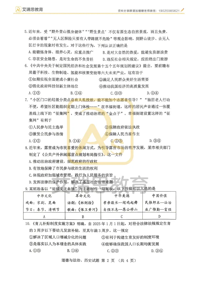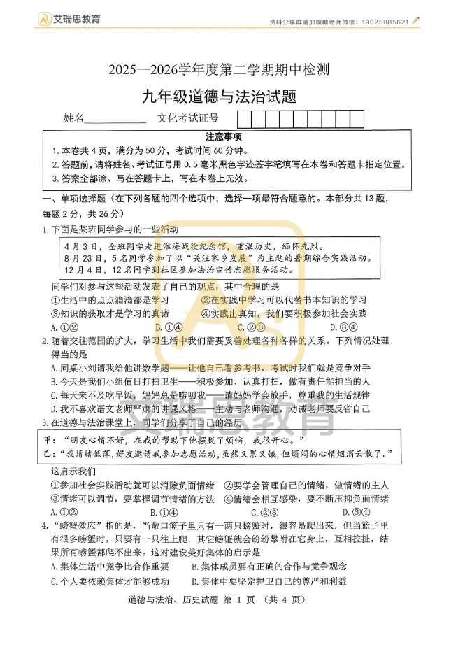 九年级下册道德与法治模拟试卷