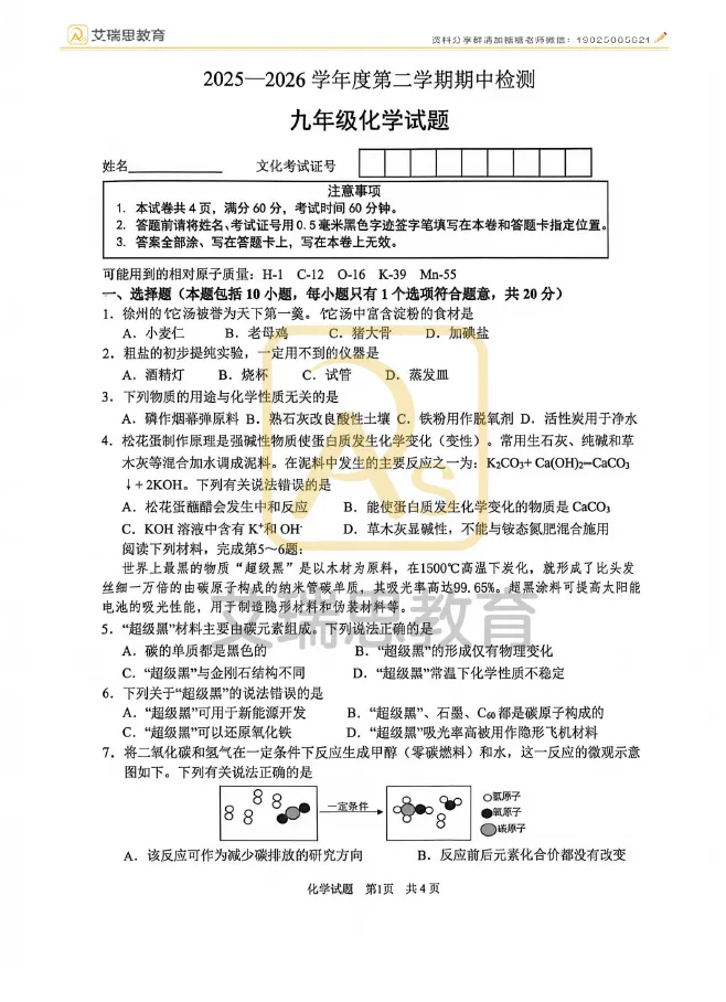 【试卷分享】2025-2026学年九年级下册化学结业第一次模拟练习
