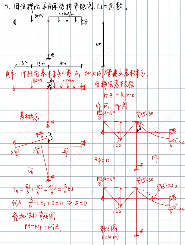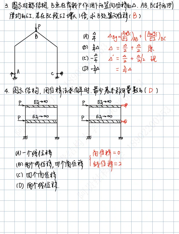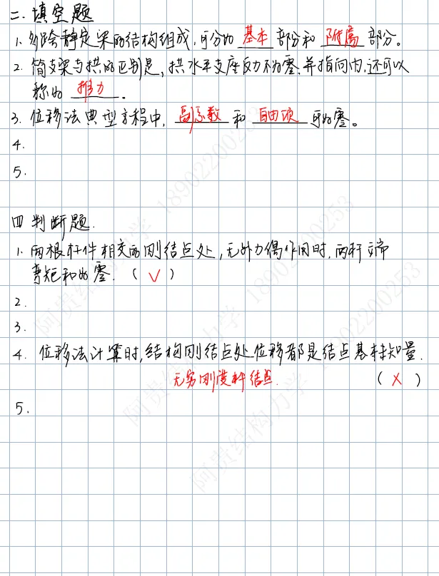 选择题、填空题、判断题考察最基本的概念,如几何构造性、连续梁组成、位移法的基本未知量等。