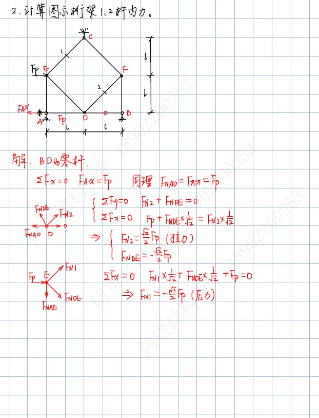 第二题:计算桁架指定杆件内力,常考的题,于玲玲教材原题;