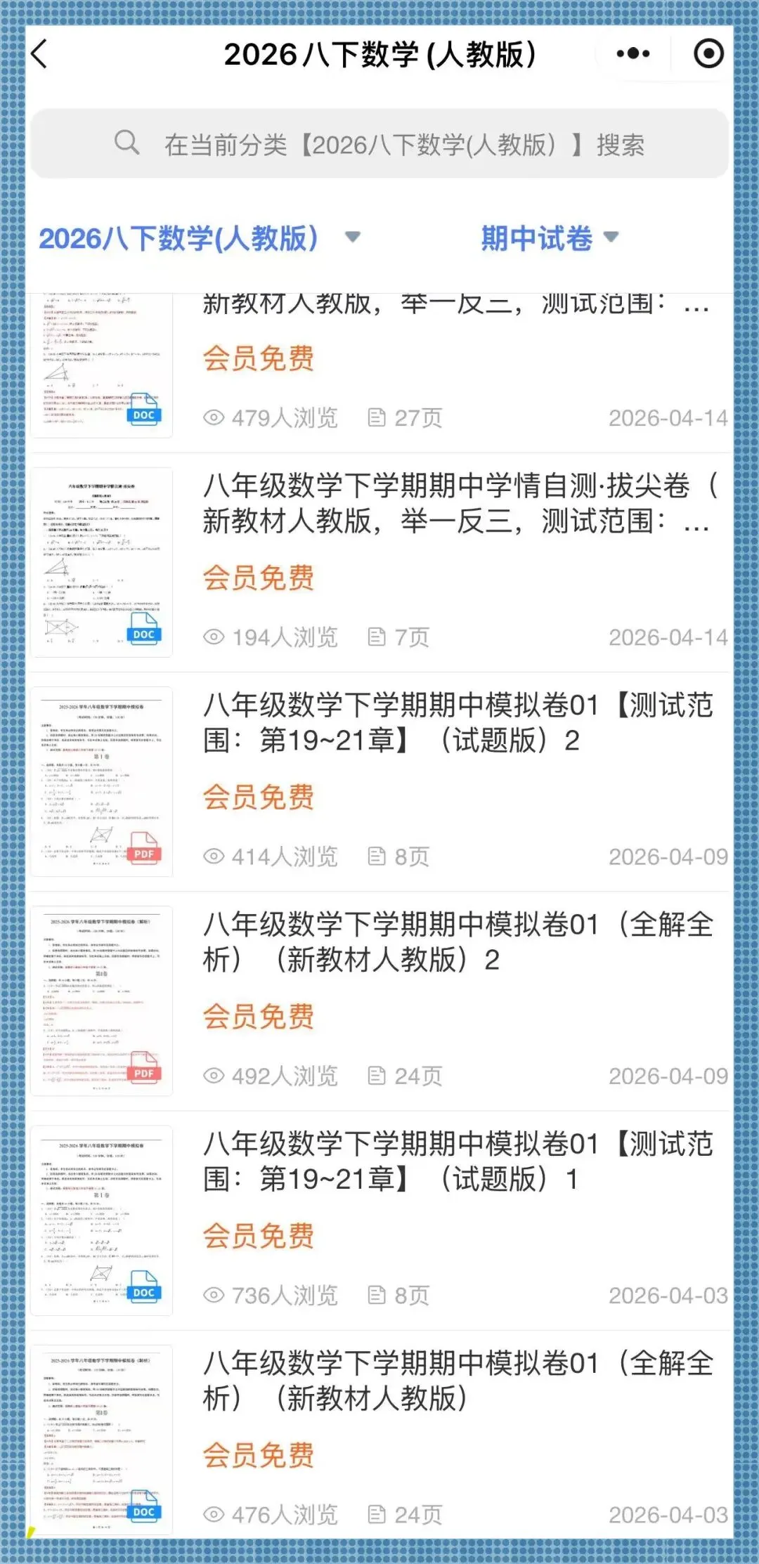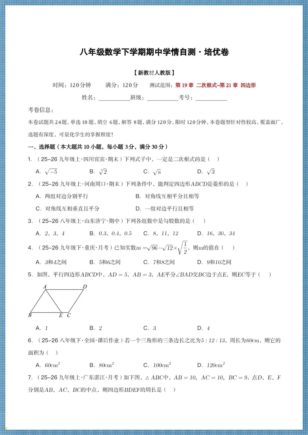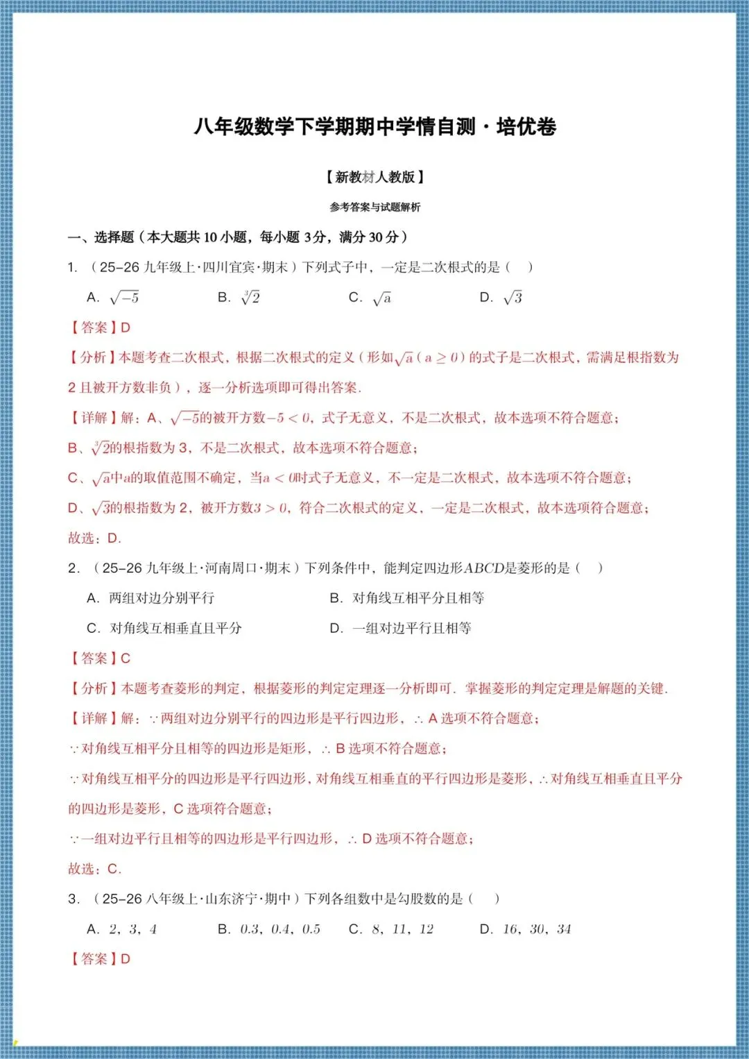 2026初二八下数学期中试卷+解析(共5套),电子版可下载打印!