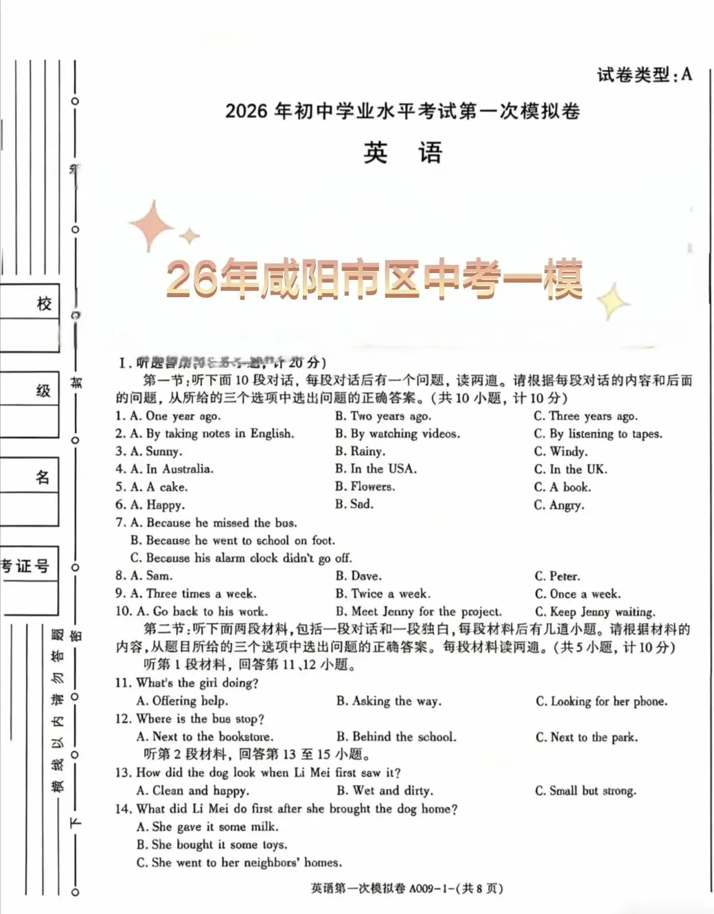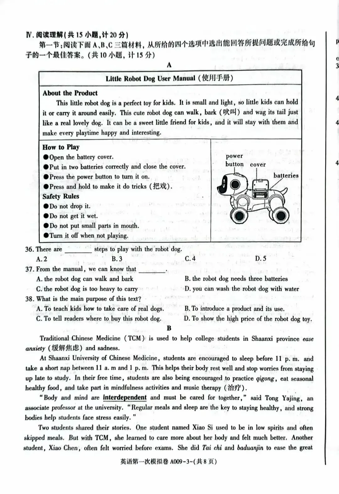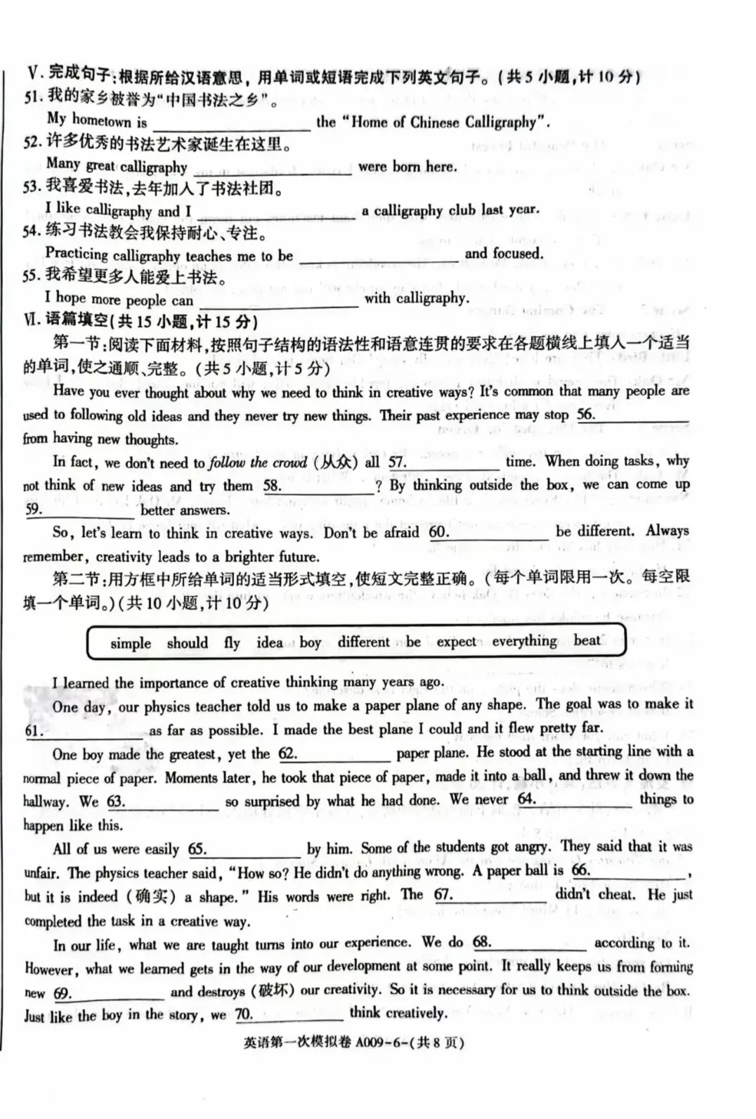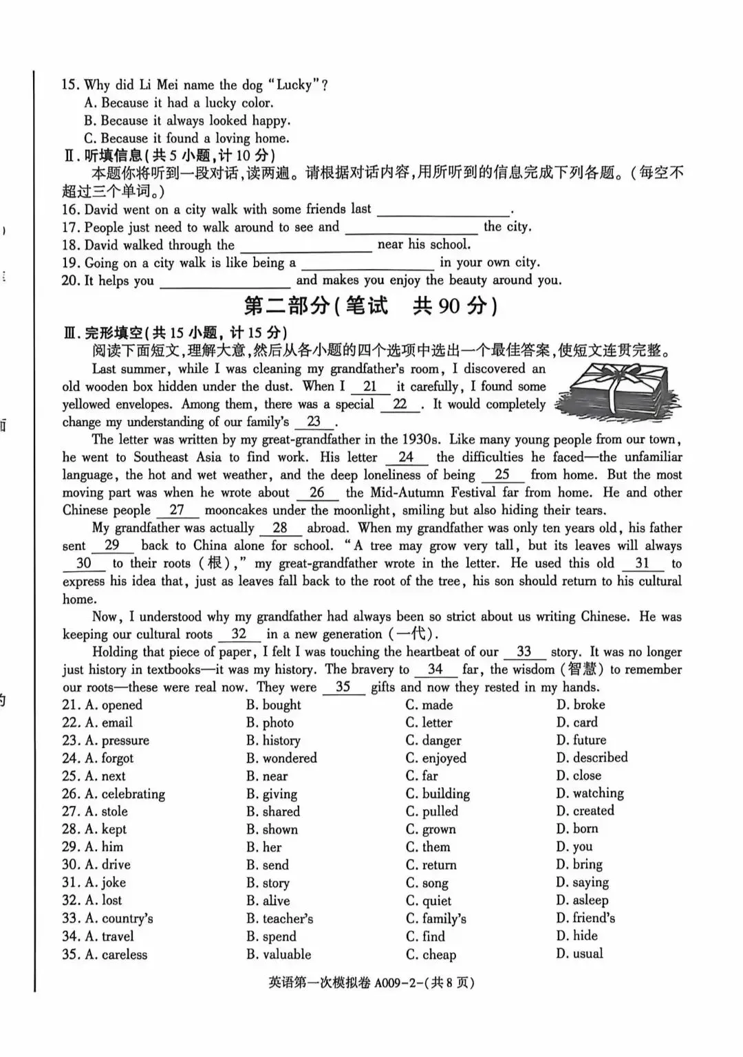 总体评价:该试卷作为中考一模,难度控制合理,兼顾基础与能力,区分度较好。完形填空和语篇填空的第二节稍有挑战,阅读理解整体友好,适合检测学生阶段性复习效果。