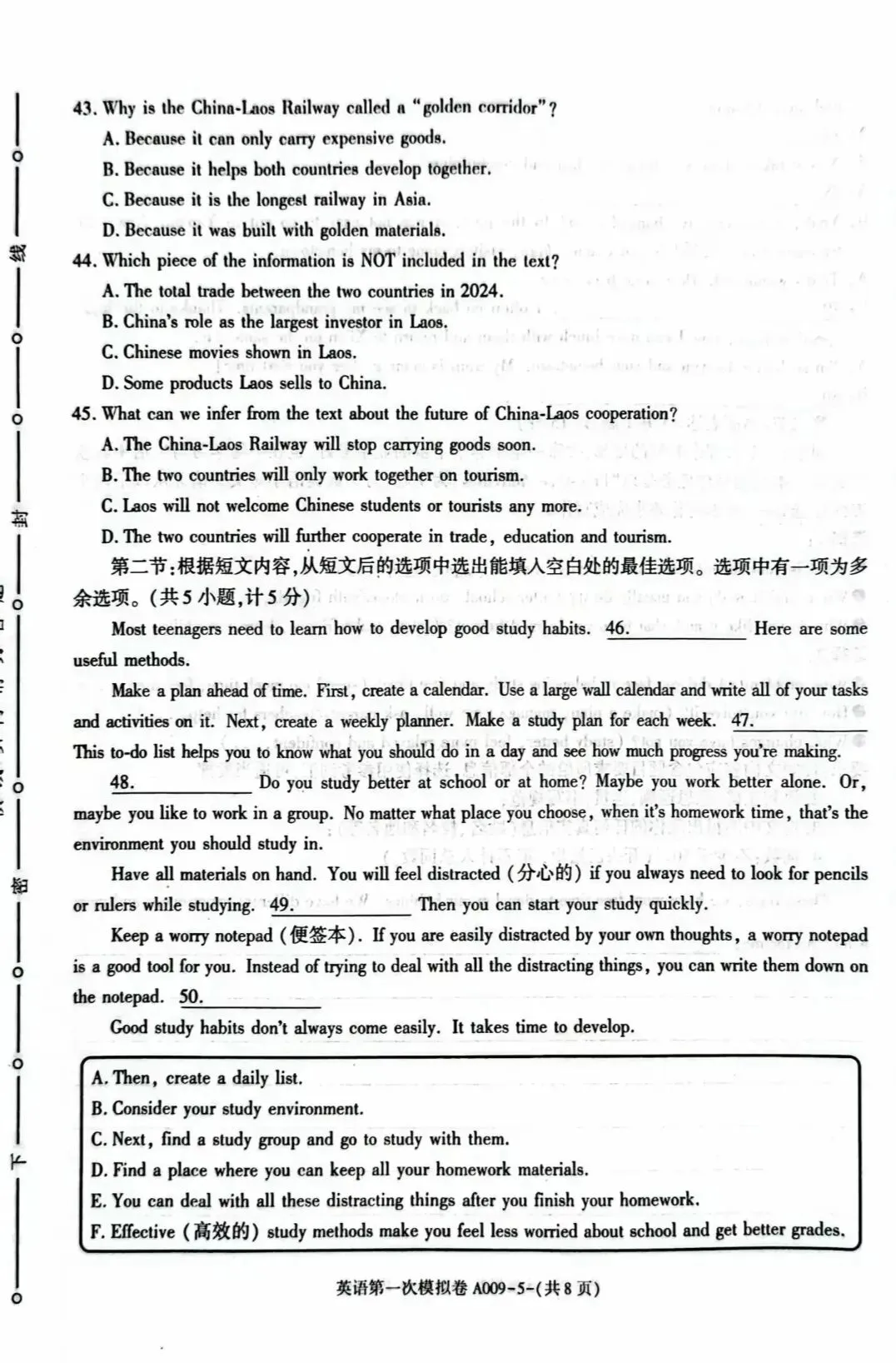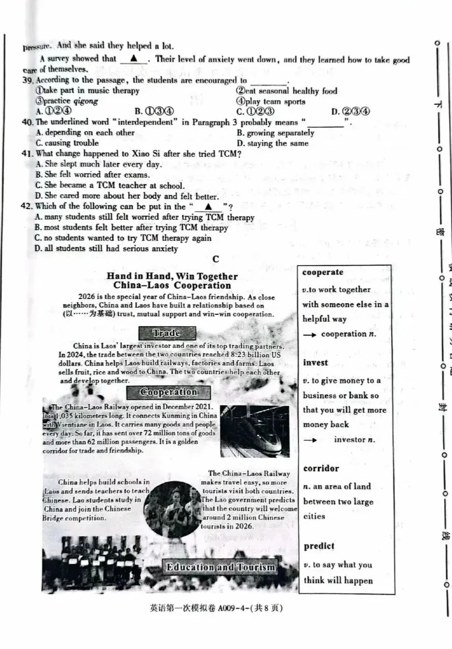 A篇容易,B篇中等(中医主题),C篇中等偏易(中老合作)。七选五中等,逻辑清晰