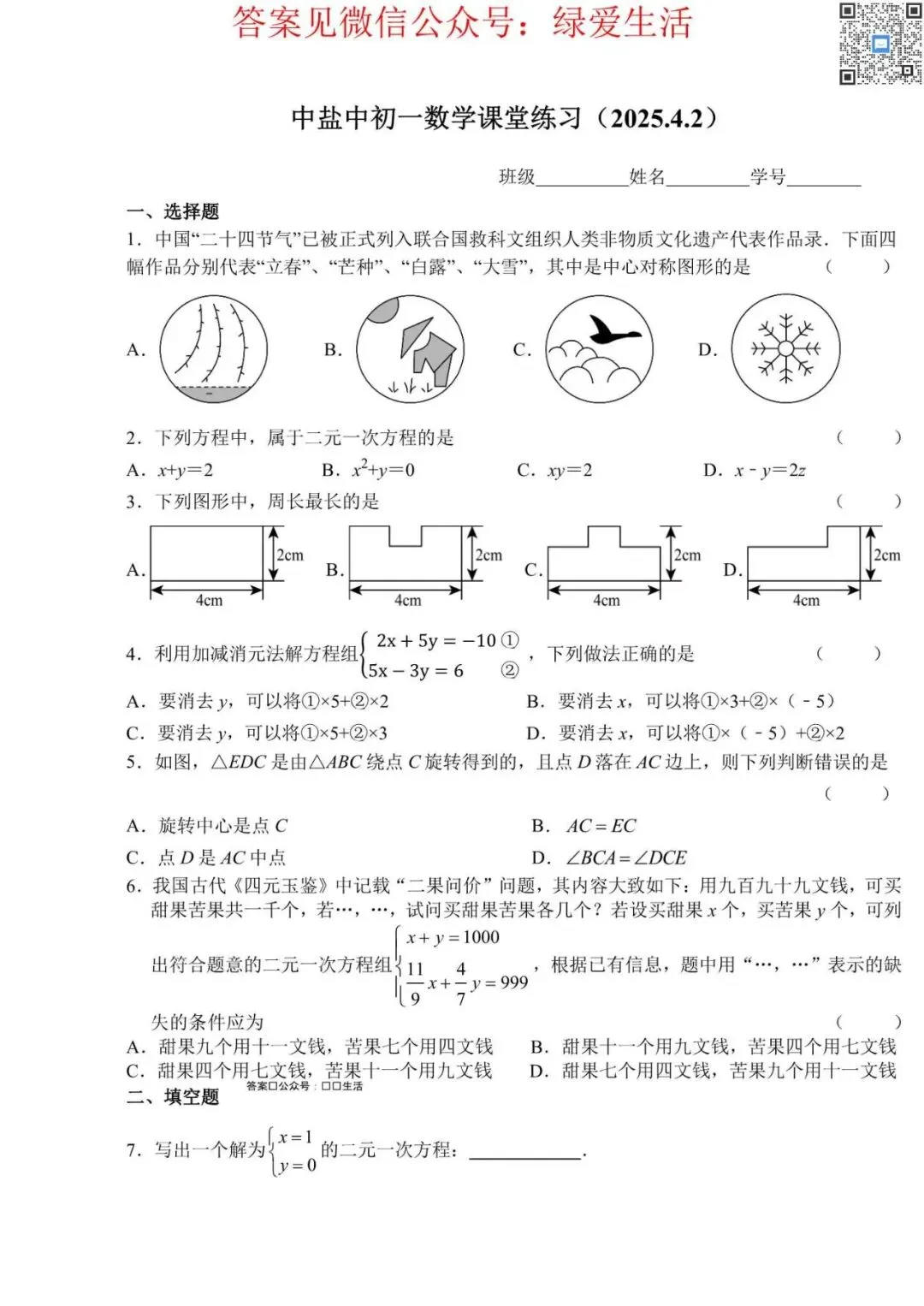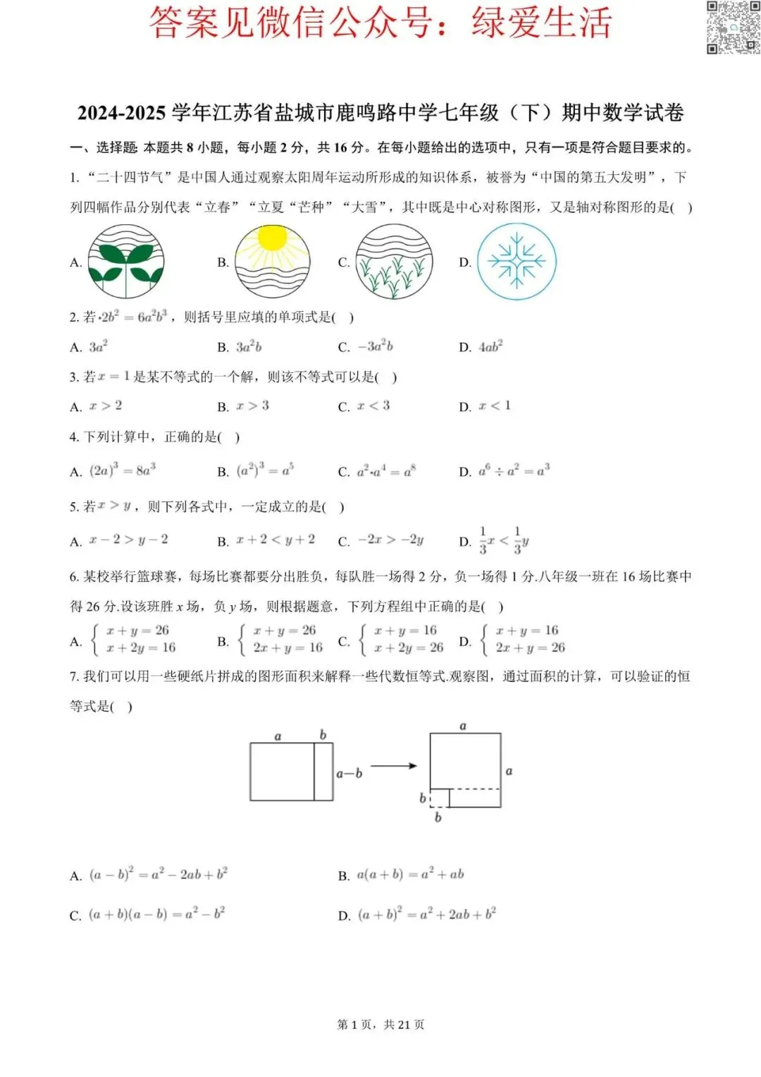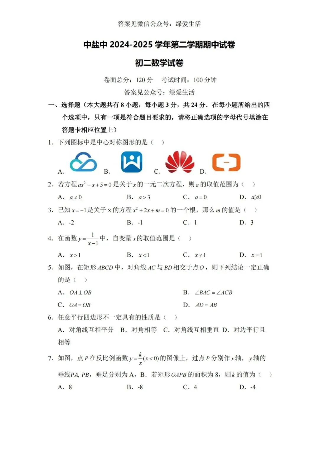 【中盐中】初一初二期中数学试卷+答案(25年4月)