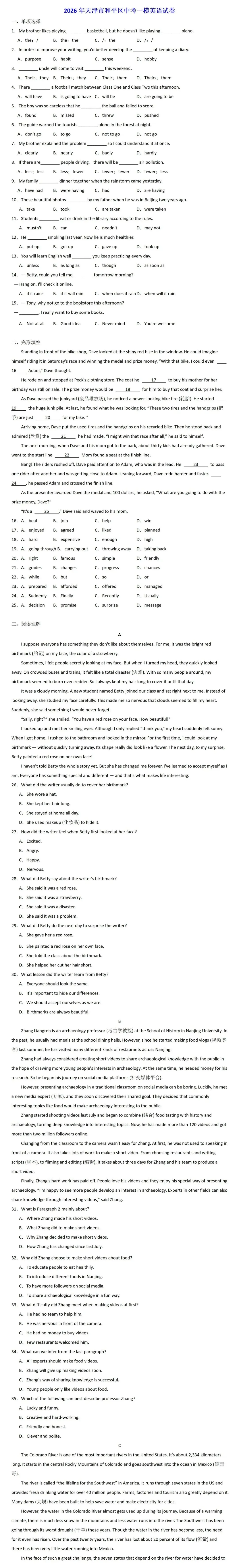 >2026年天津市和平区中考一模英语试卷