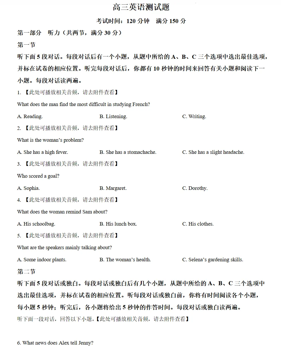 >高三英语测试题试卷及答案