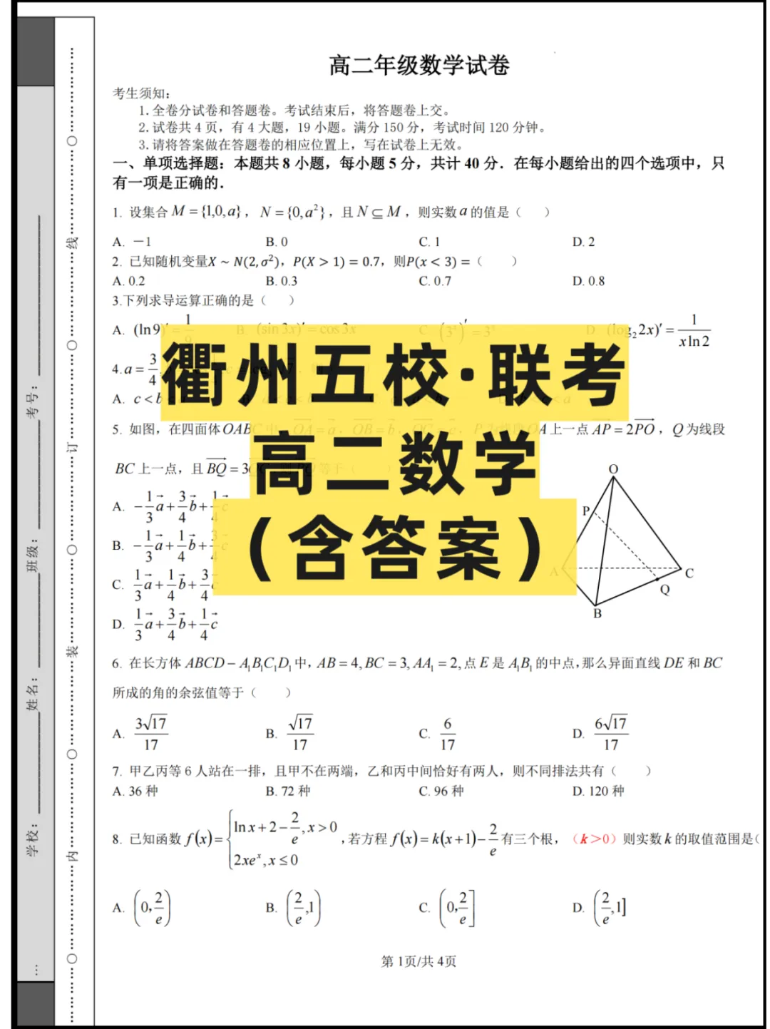 >2026浙江(衢州五校)高二4月联考,试卷+答案解析