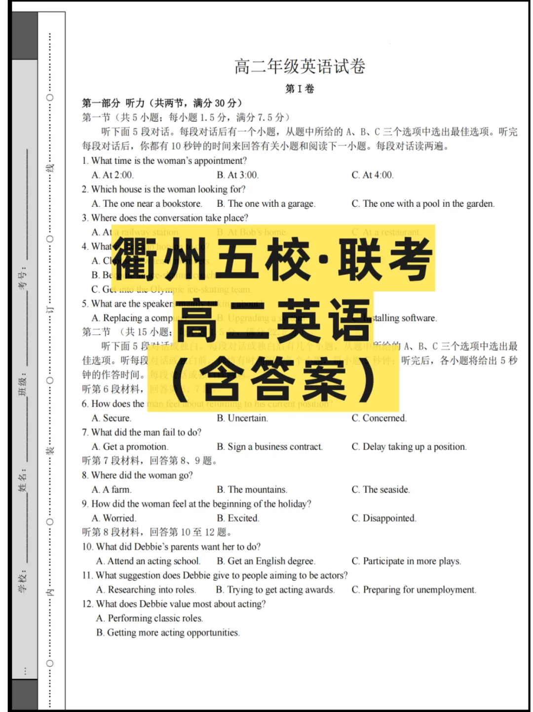 电子版试卷+答案
